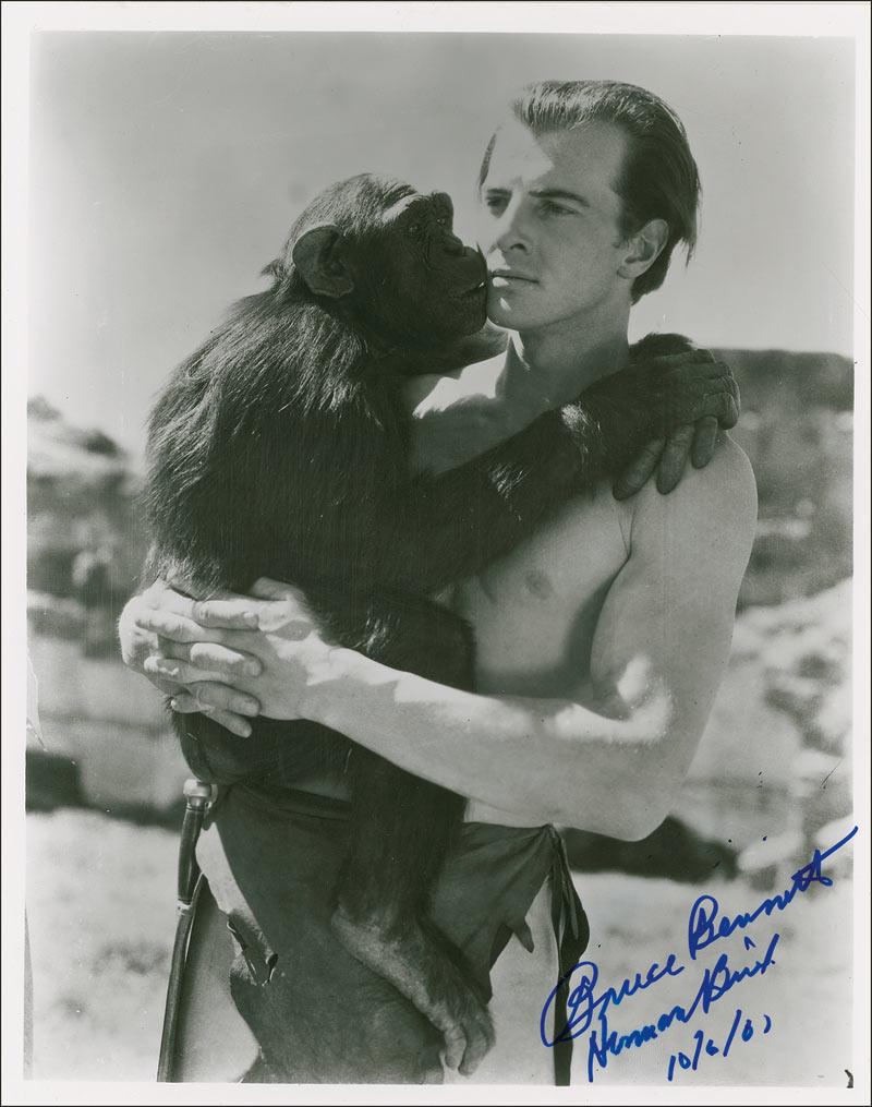 Glossy 8 x 10 photo of Tarzan and Cheetah, signed in blue felt tip, “Bruce Bennett, Herman Brix, 10/6/01.” In fine condition.