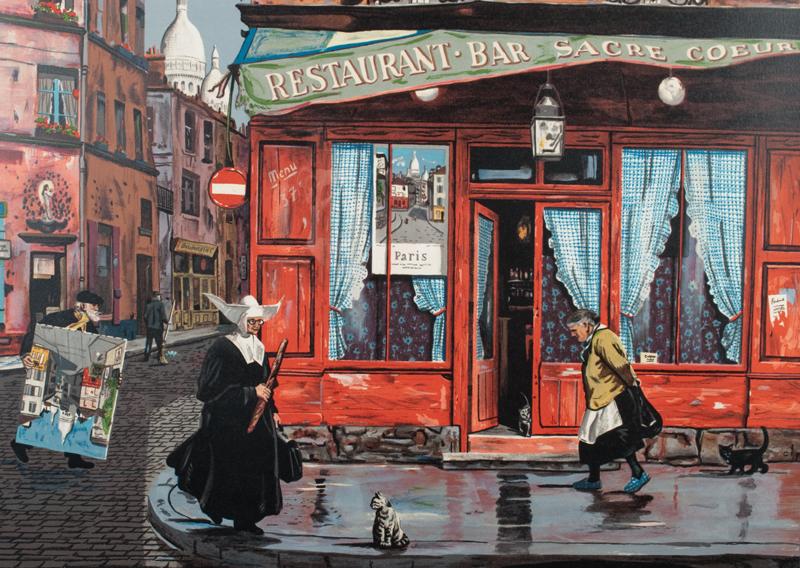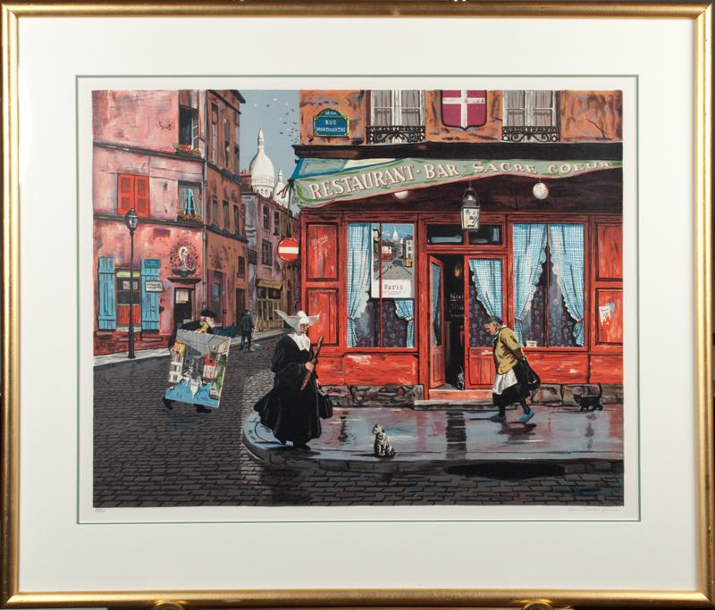 Titled, "Sacre Couer," depicting a city street scene with a nun, a cat and other figures about. Signed in pencil in LR, edition no. 89/225 in LL. Bruce Bomberger, (1918-1980), California/New York, known for illustration, wildlife, genre paintings. Matted and framed behind glass, 29.5" H x 24.25" W, including frame. Appraised in 1988 by Chicago Appraisers Association for $750.