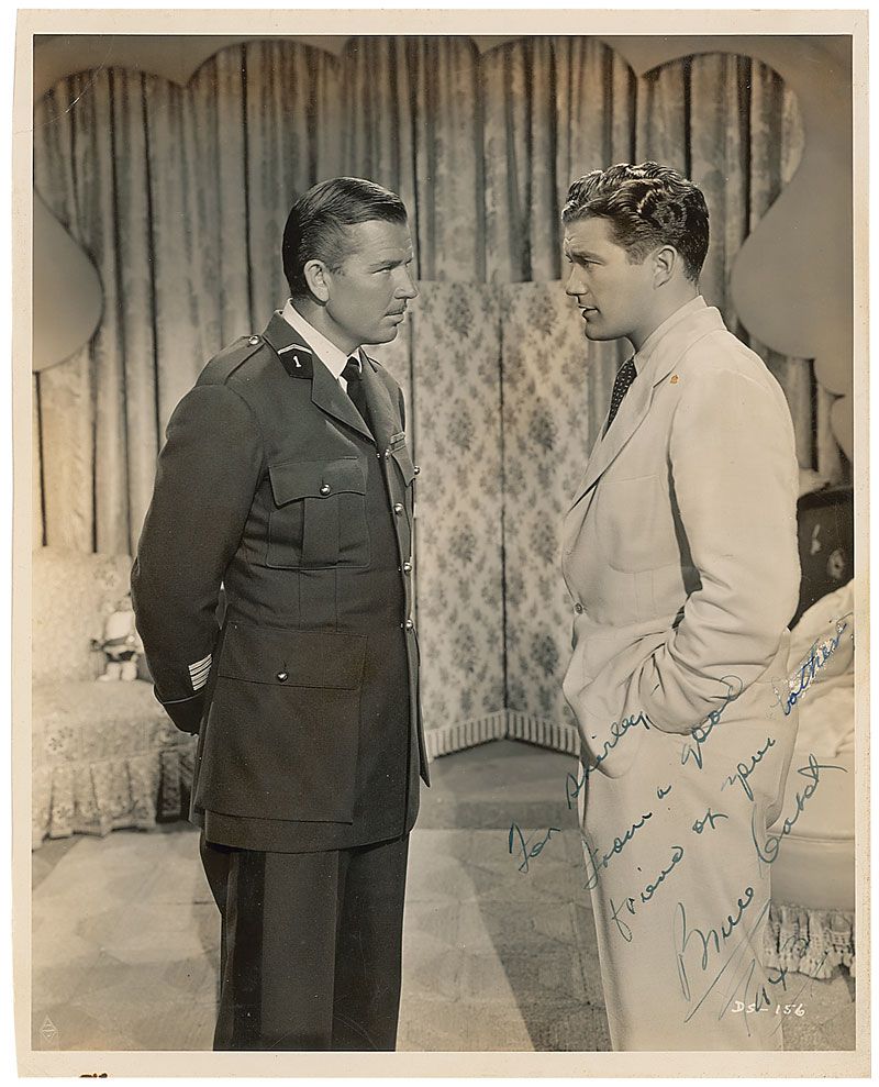 Vintage glossy 8 x 10 Warner Bros. publicity photo for The Desert Song, signed and inscribed in fountain pen “For Shirley—From a good friend of your brother’s, Bruce Cabot 1943.” In very good condition, with scattered creases, some surface loss under a single word in inscription, and scattered light silvering.