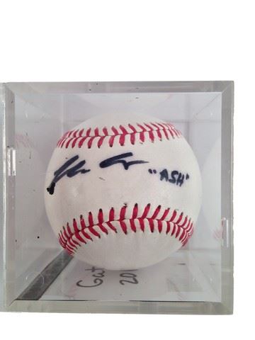 Bruce Campbell signed baseball in plastic display case. In 1979 with his Detroit friends, Sam Raimi and Rob Tapert, Bruce Campbell raised $350,000 for a low-budget film, The Evil Dead (1981), in which he starred and co-executive produced. Completed piecemeal over four years, the film first gained notoriety in England where it became the best-selling video of 1983, beating out The Shining (1980). After its appearance at Cannes, where Stephen King dubbed it "the most ferociously original horror film of the year", New Line Cinema stepped forward to release "Evil Dead" in the U.S. (3"x3")