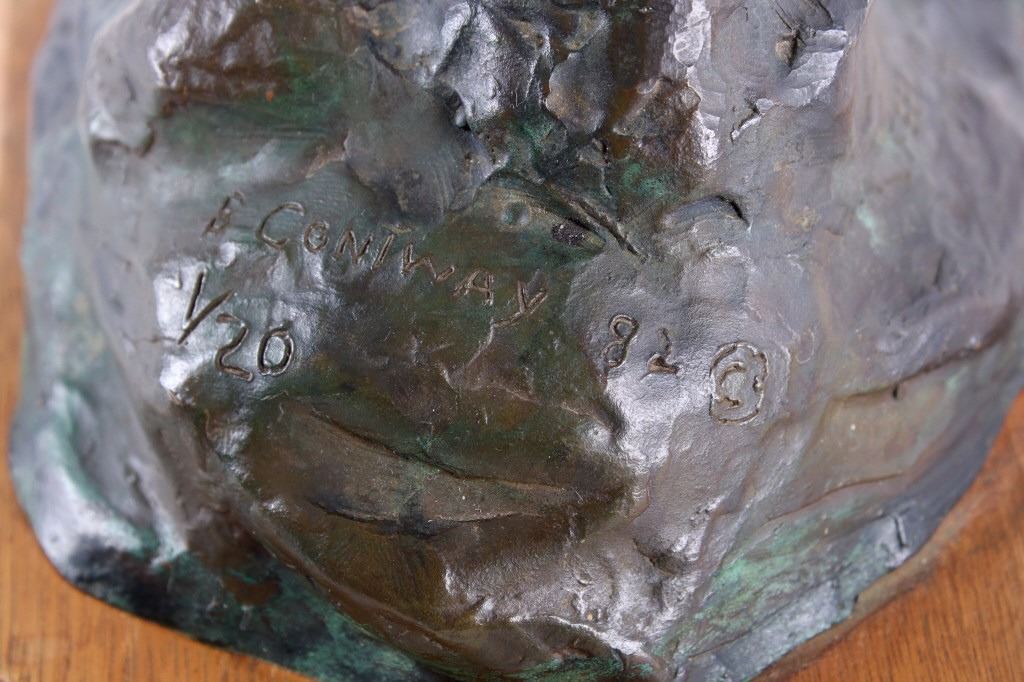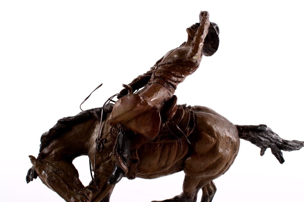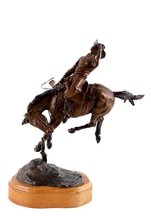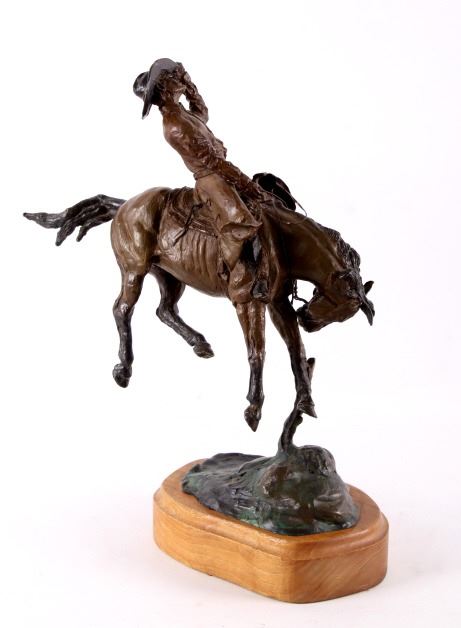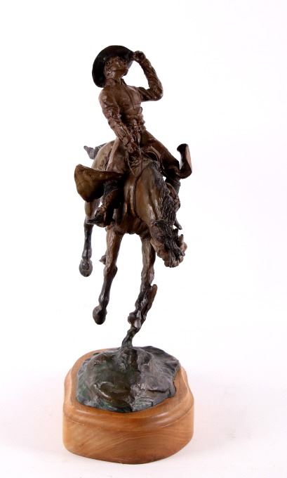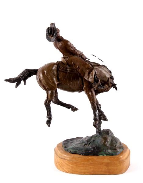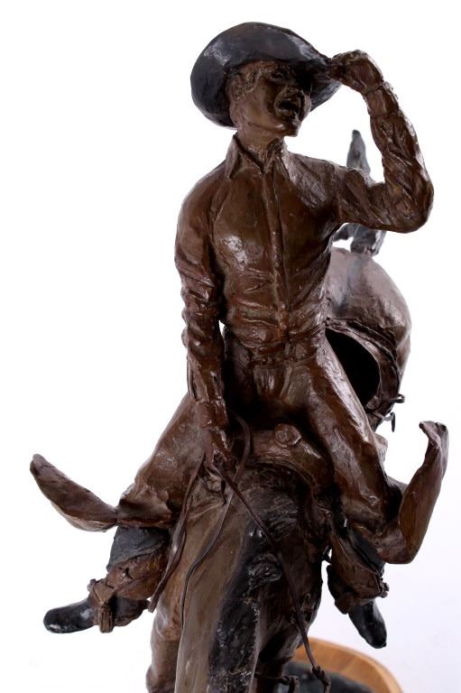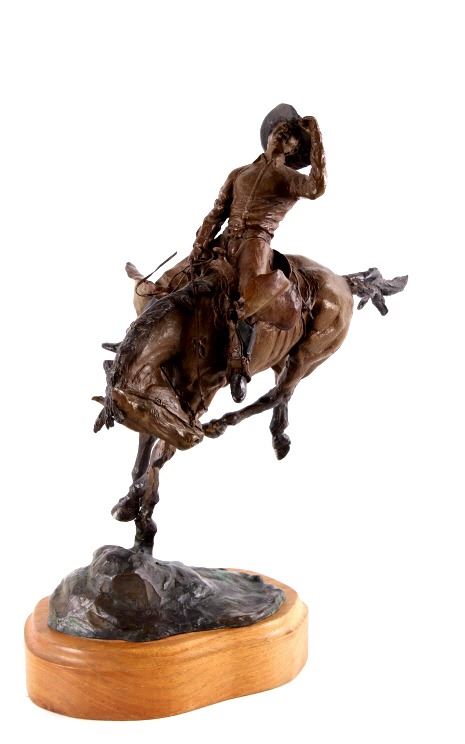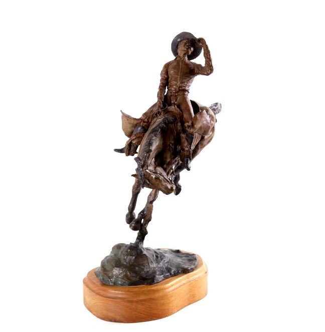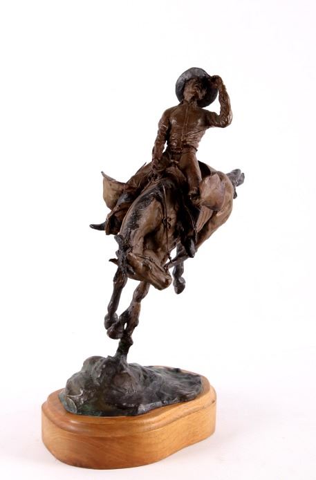 For your consideration is this excellent Western bronze by Great Falls, Montana sculptor, Bruce Contway. The numbered (1/20) piece is titled, "Feeling His Oats"; it depicts a cowboy on a bucking bronc. The bronco is mid-jump with all four hooves off the ground and neck and head tucked, trying its hardest to eject the rider. With his feet in the stirrups and his chaps flapping, the cowboy, in effort to stay on, is leaning all the way back and holding on to the reins with one hand; with the other hand, he is holding on to his hat. The bronze rests on a 6" x 8.5" blonde wood base; the sculpture is about 17" tall all together, and is about 15" long x about 7.5" wide. The sculpture shows excellent condition.