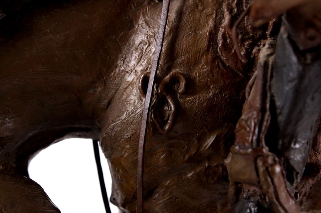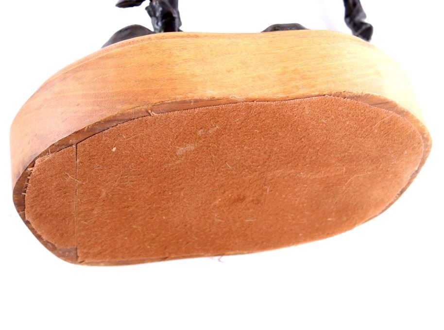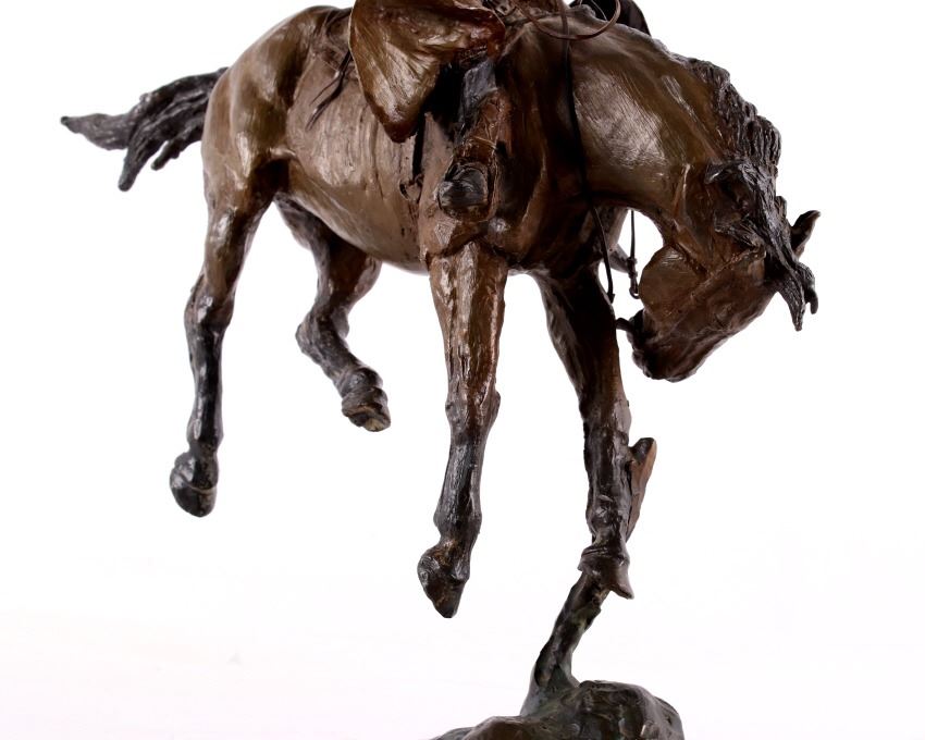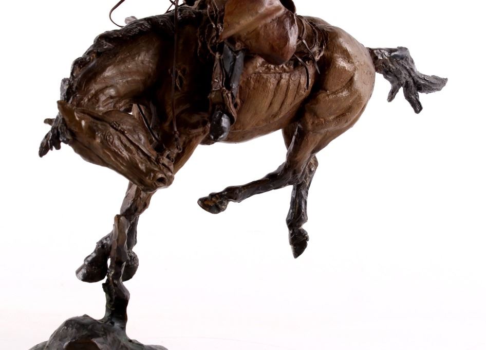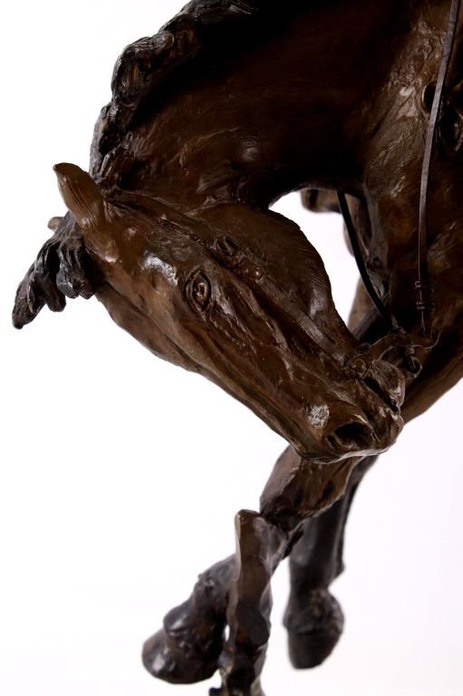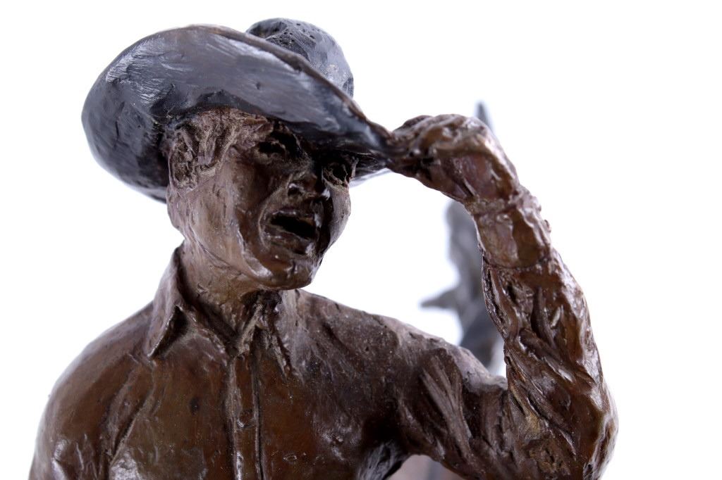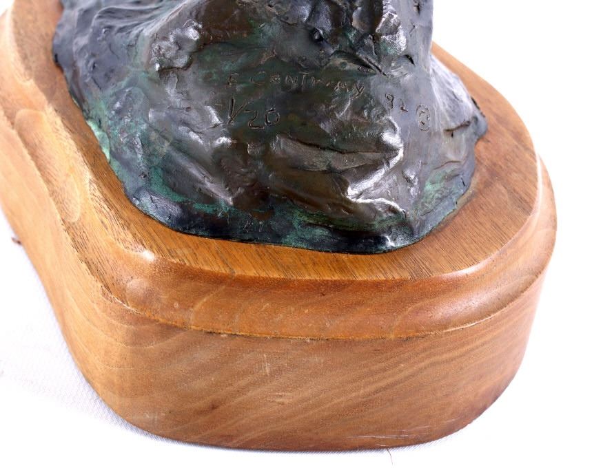 For your consideration is this excellent Western bronze by Great Falls, Montana sculptor, Bruce Contway. The numbered (1/20) piece is titled, "Feeling His Oats"; it depicts a cowboy on a bucking bronc. The bronco is mid-jump with all four hooves off the ground and neck and head tucked, trying its hardest to eject the rider. With his feet in the stirrups and his chaps flapping, the cowboy, in effort to stay on, is leaning all the way back and holding on to the reins with one hand; with the other hand, he is holding on to his hat. The bronze rests on a 6" x 8.5" blonde wood base; the sculpture is about 17" tall all together, and is about 15" long x about 7.5" wide. The sculpture shows excellent condition.
