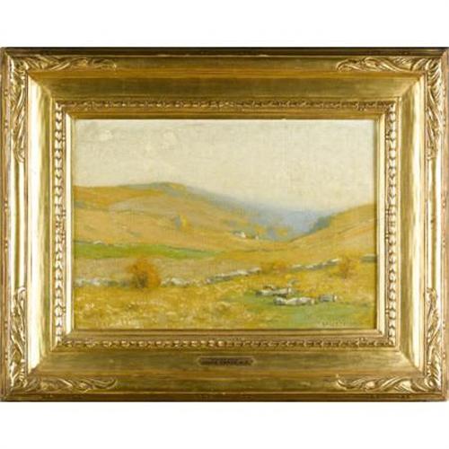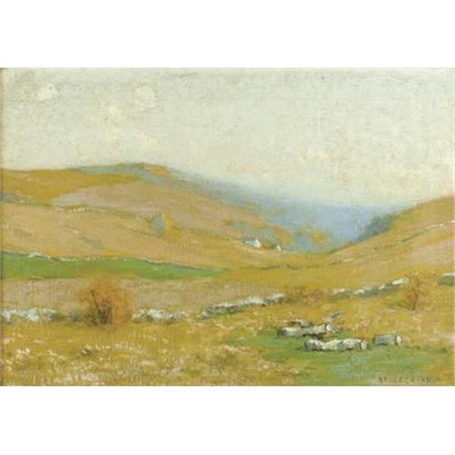 <B>BRUCE CRANE (American, 1857-1937)</B></I><BR><I>Golden Hills</B></I><BR>Oil on canvas<BR>14-1/4 x 20-1/4 inches (36.2 x 51.4 cm)<BR>Signed lower right: <I>Bruce Crane</B></I><BR>Label verso: <I>3721 / 14 x 20 / Bruce Crane, N.A. / Golden Hills</B></I><BR>Inscribed verso on canvas: <I>3546 / 14 x 20</B></I><BR>