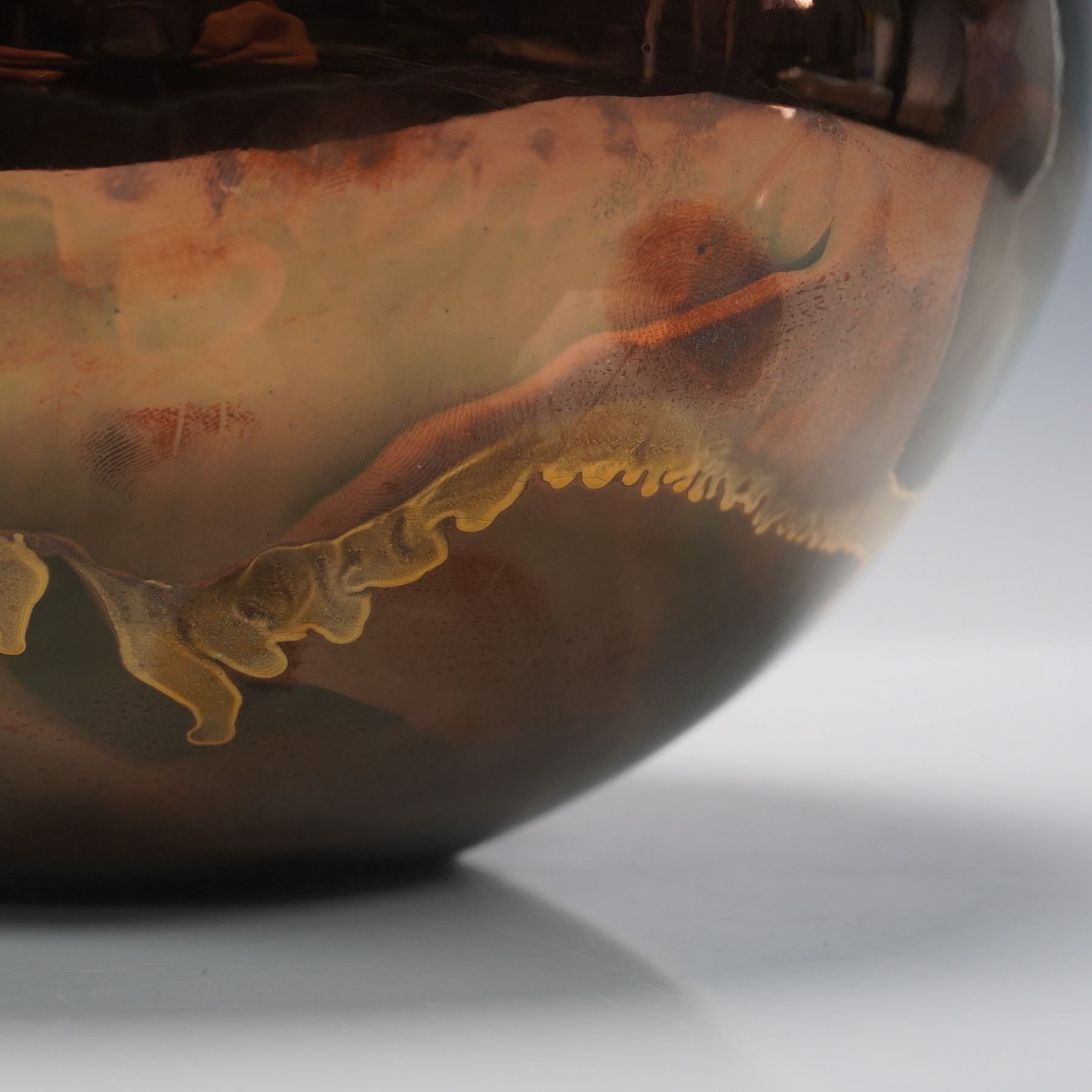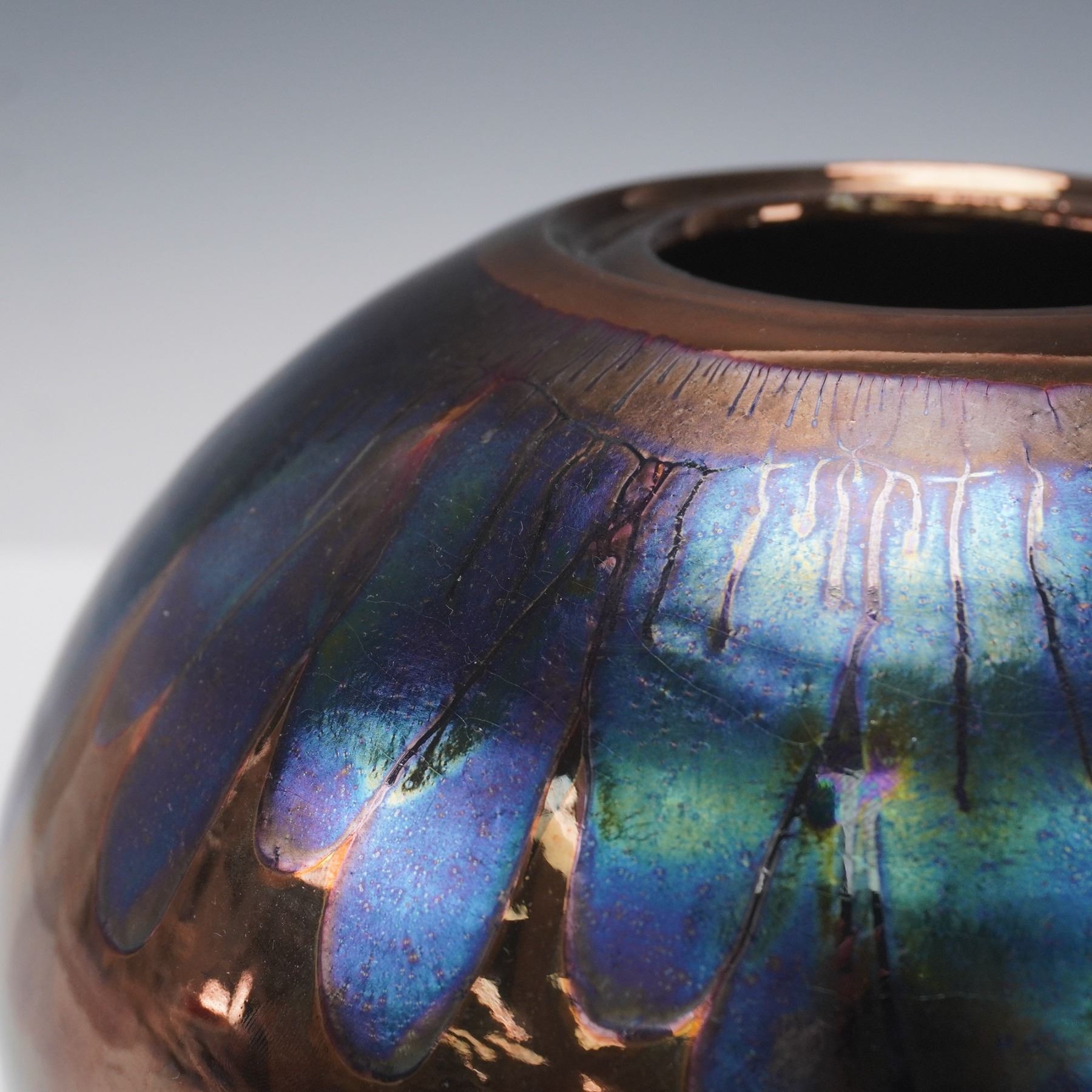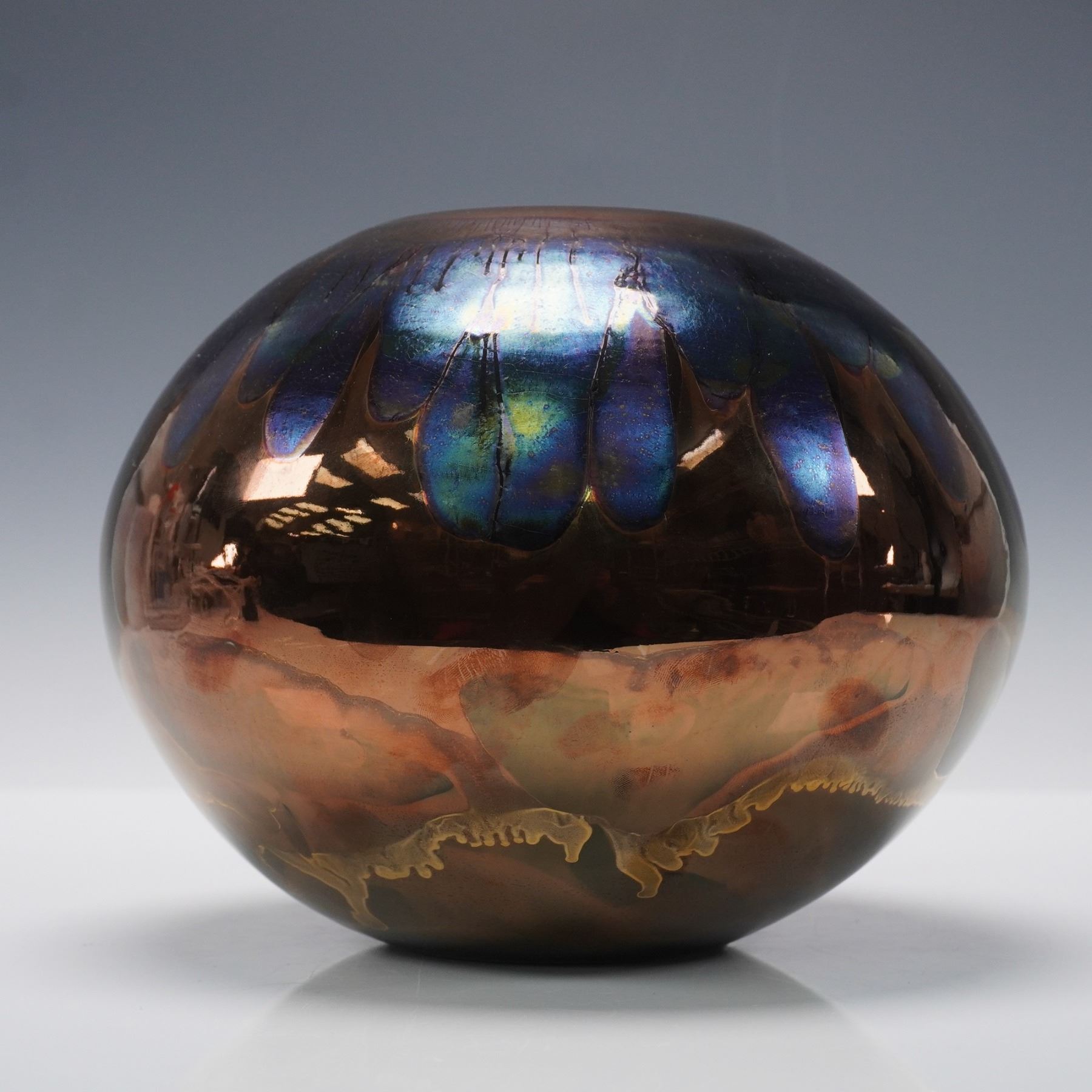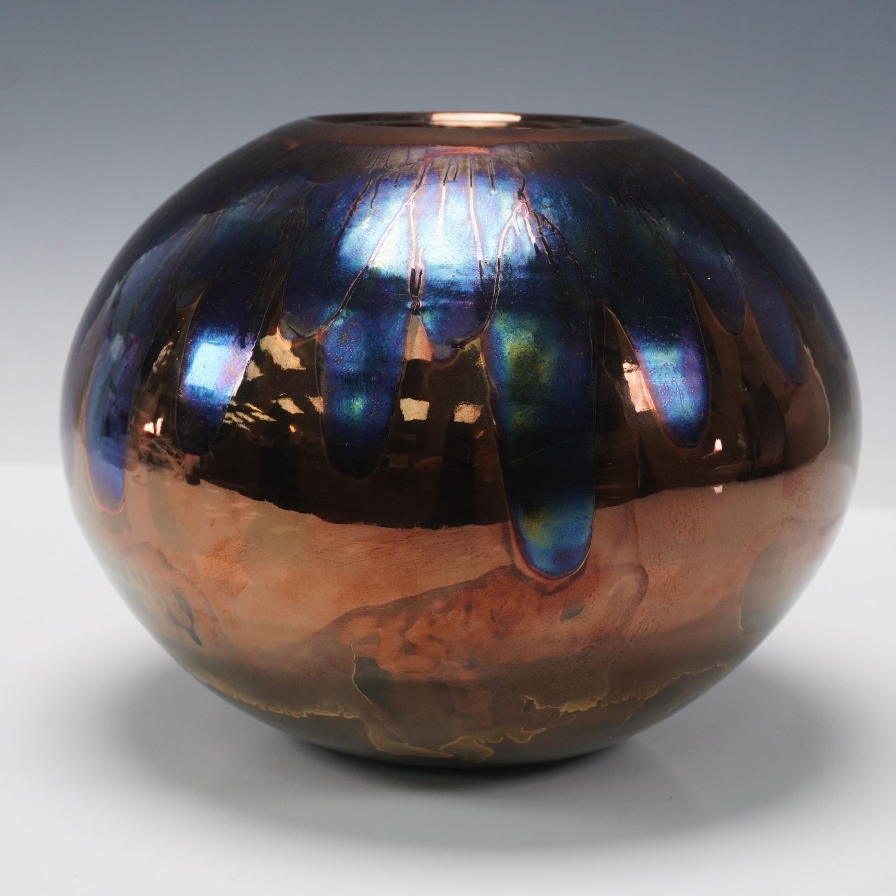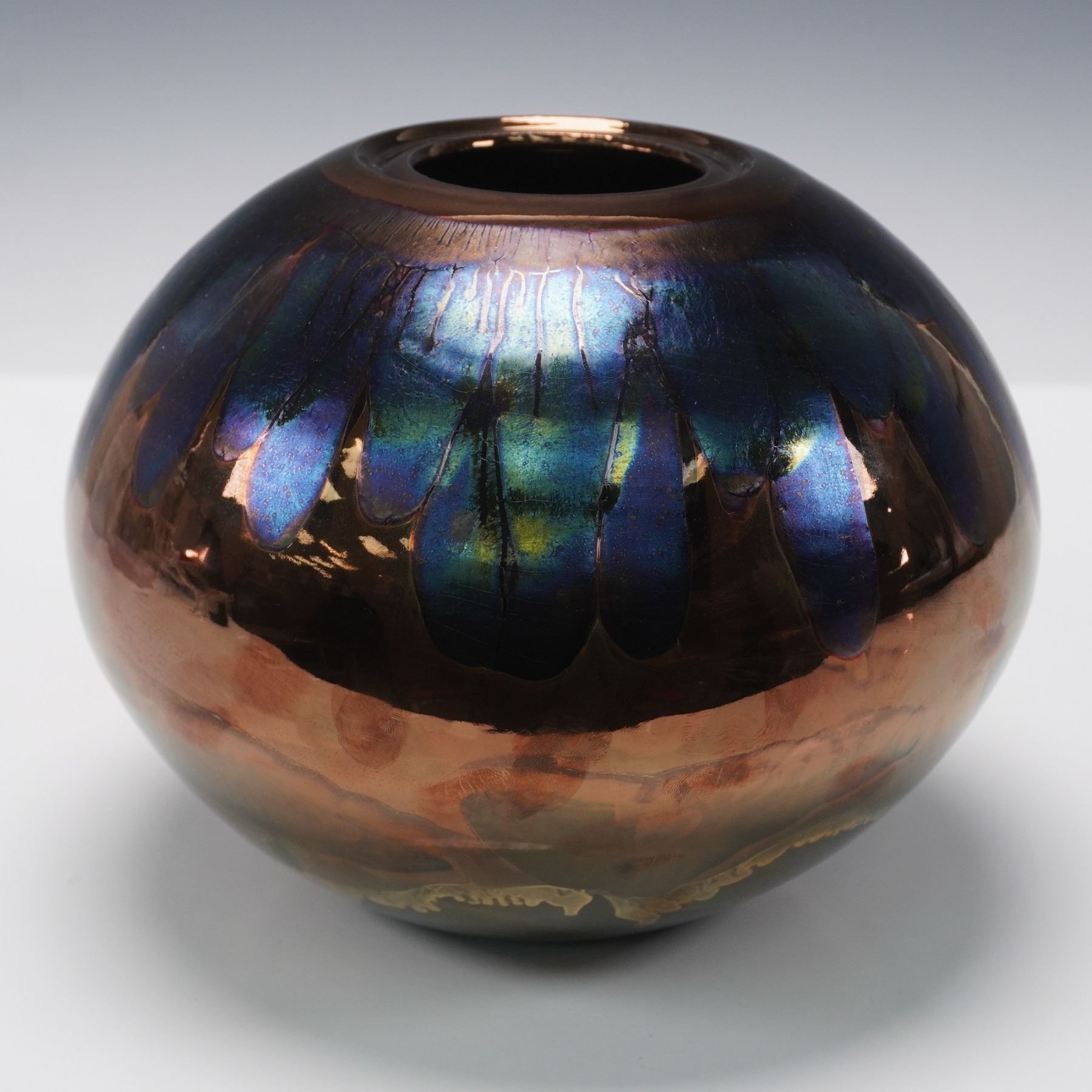 A striking Raku-fired pottery vessel by California artist Bruce Fairman, signed and dated 2002 on the underside. This rounded, lidded-form vessel - presented without its original lid - is finished in a richly iridescent copper glaze with cascading blue, violet, and green feathered drips near the top. The surface exhibits the hallmarks of Raku technique, with a lustrous metallic sheen and organic, smoke-fired textural patterns throughout the lower half. A dramatic decorative piece with strong presence.