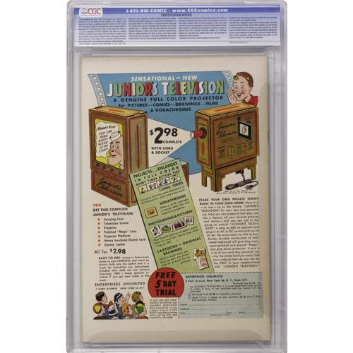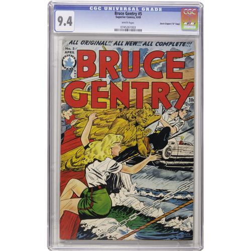 <B>Bruce Gentry #5 Davis Crippen ("D" Copy) pedigree (Superior, 1949) CGC NM 9.4 White pages.</B></I> This would seem to be the nicest copy in existence -- in fact, we know it's nicer than the Mile High, since we just auctioned that Edgar Church copy (an uncertified VF). The issue's got Jack Kamen-esque cover art. Overstreet 2006 NM- 9.2 value = $290. CGC census 9/06: 1 in 9.4, none higher. <I>From the Crippen Collection</B></I>.<BR><BR><b>Shipping:</b> Slabbed Comic (<a target="_blank" href="http://www.heritageauctions.com/common/shipping.php">view shipping information</a>)