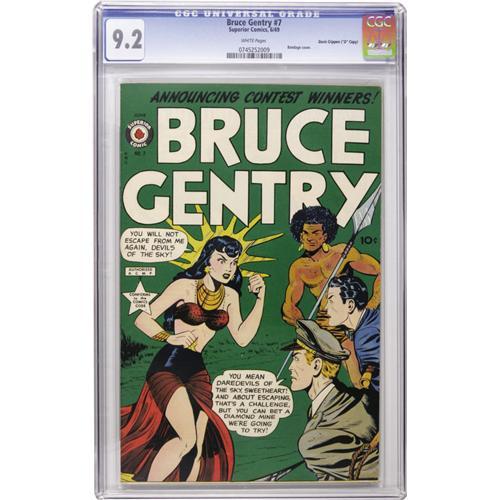 <B>Bruce Gentry #7 Davis Crippen ("D" Copy) pedigree (Superior, 1949) CGC NM- 9.2 White pages.</B></I> Yet another Gerber "white space" from the Crippen collection! A Jack Kamen-esque cover graces this issue. Note the outstanding page quality. Overstreet 2006 NM- 9.2 value = $290. CGC census 9/06: 2 in 9.2, none higher. <I>From the Crippen Collection</B></I>.<BR><BR><b>Shipping:</b> Slabbed Comic (<a target="_blank" href="http://www.heritageauctions.com/common/shipping.php">view shipping information</a>)