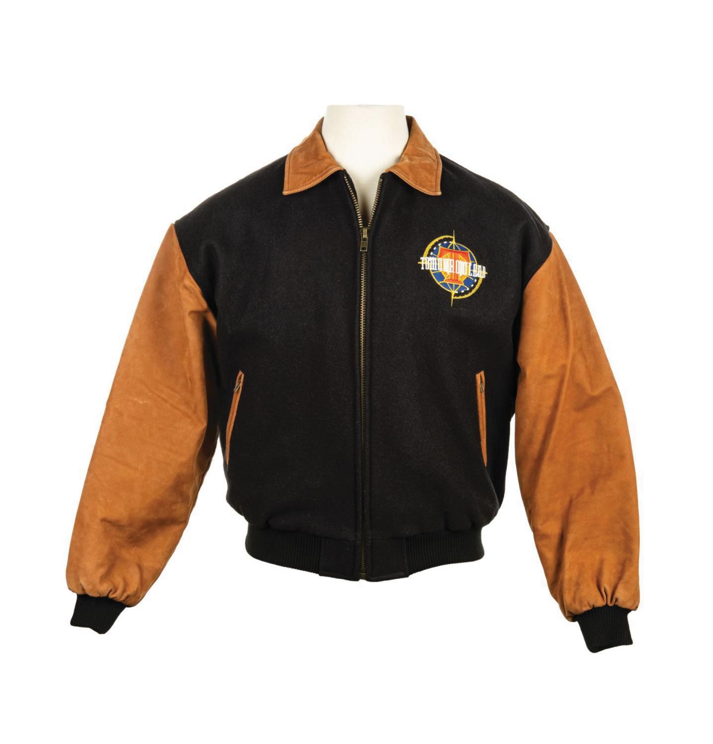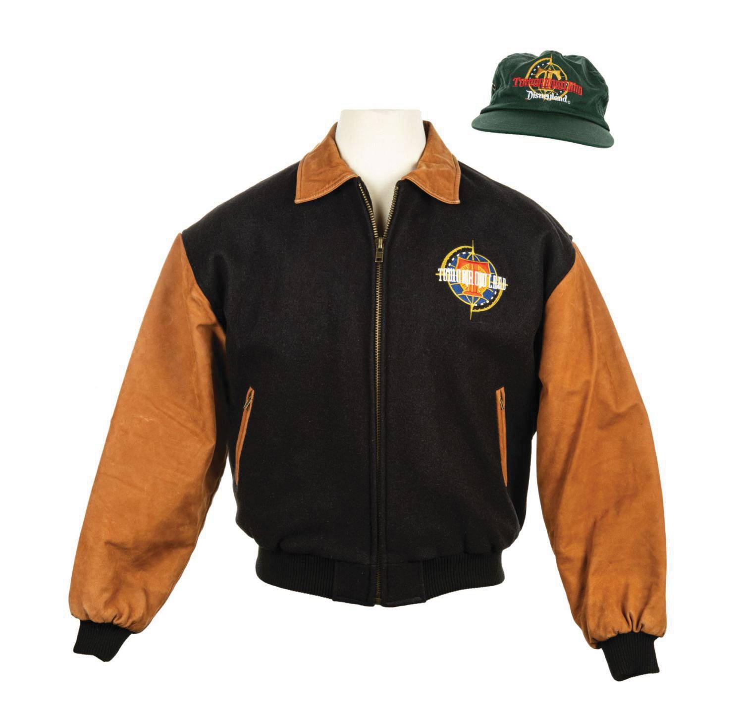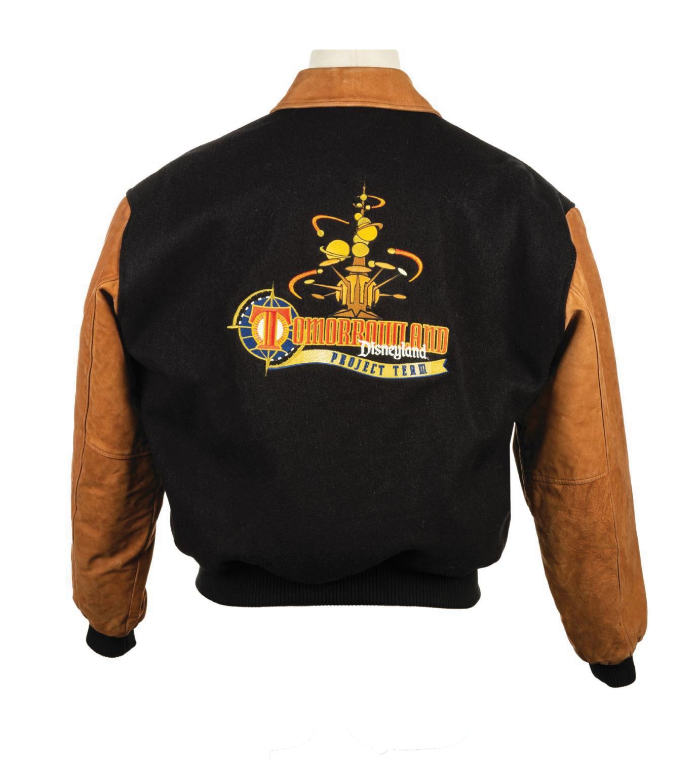 (Disneyland, 1998) A jacket and hat created exclusively for the Tomorrowland Disneyland Project Team, once owned by Walt Disney Imagineer Bruce Gordon. Gordon contributed to the development of Splash Mountain and the Finding Nemo Submarine Voyage, and famously co-wrote numerous publications with fellow Imagineer David Mumford, including the popular The Nickel Tour book. The two-tone jacket features golden brown leather sleeves with a body of black felt wool and black fabric gathered waist and sleeve cuffs. The garment bears an embroidered Tomorrowland logo on the left chest and a large, embroidered Tomorrowland Project Team graphic on the reverse. The hat is adjustable while the jacket is a size large. The set retains a COA typed on a sheet of Bruce Gordon's Walt Disney Imagineering stationary.