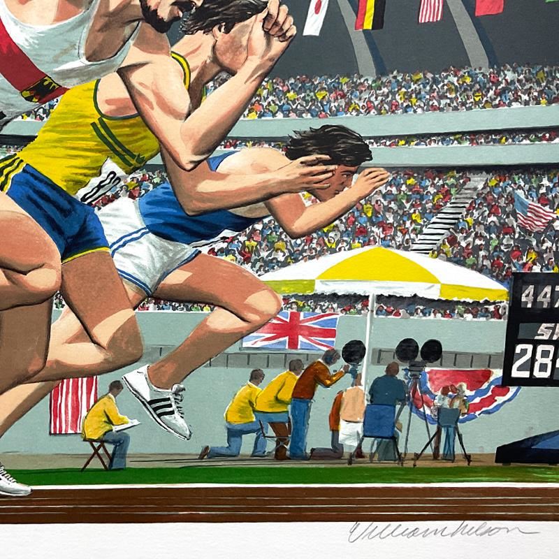 "Bruce Jenner 100 M Dash" is a limited edition lithograph on paper from an AP edition, hand signed by William Nelson. Includes Letter of Authenticity. Measures approx. 29" x 22" (border), 26" x 19" (image). There may be minor imperfections in the white border area but the piece is in overall good condition.