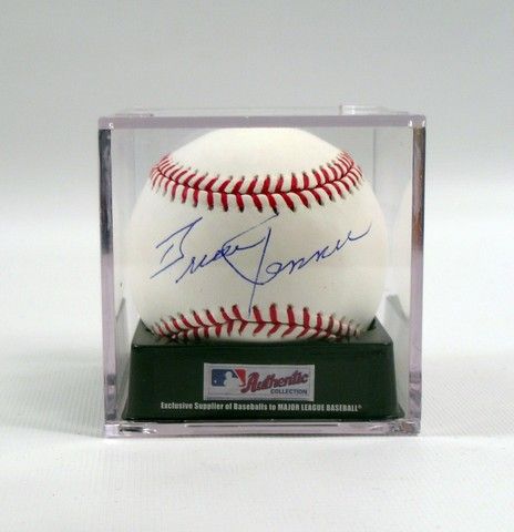 These days, most people don't realize that the infamous Bruce Jenner was once known for having won the gold in the Decathlon at the 1976 Summer Olympics. Today his name is immediately joined to the hip with the Kardashian empire, as well as some continual Michael Jackson style plastic surgery augmentations. But all this only makes him as fresh as today's TMZ headlines! This is Jenner's signature on an official Rawling Official Major League Baseball, a nod to his more sports related youth! The autographed baseball is encased in an Ultra-Pro UV protected Ball Holder. (Custom case is 3"x3").