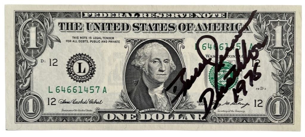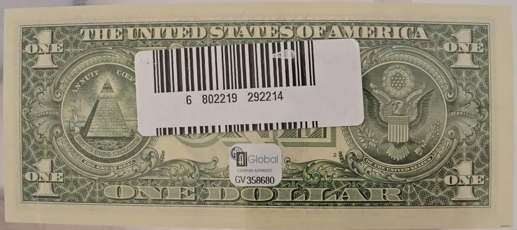 Bruce Jenner Decathalon 1976 signed dollar bill. Authenticated by Global Authentics. FL3
