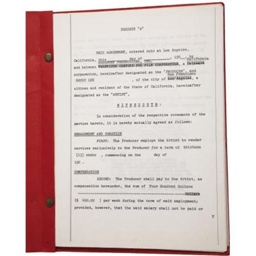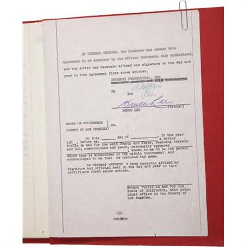 <B>Bruce Lee Document Signed: His </B></I><B><I>Green Hornet</B></I></B></I><B> Contract.</B></I> 39 pages, 9" x 11.5", housed in red titled paper wraps, Los Angeles, June 8, 1965. The 39 page contract is an option agreement between Bruce Lee and Greenway Productions for Lee's role as Kato in the <I>Green Hornet</B></I>. Lee was to be paid on a graduated scale from $400 per week for a 13-week option, to $1,000 per week for a one-year-option. The remainder of the document spells out the agreement's specifics in detail, including transportation, "moral turpitude", disability and a clause requiring dental work if deemed necessary "to improve his appearance on the screen." It is signed boldly in blue ink by Lee on the final page.<BR><BR>Kato, Green Hornet's sidekick, was the role that would catapult Lee's career in America. Born in San Francisco (in the hour of the dragon, 6-8 AM and in the year of the Dragon, November 27, 1940), but raised in Hong Kong, Lee had appeared in a number of minor films before he returned to the United States at age 18. He soon abandoned hopes of a film career and was pursuing martial arts when someone associated with the <I>Batman</B></I> television show spotted him at the 1964 Long Beach Karate Tournament. He auditioned, and the producers were impressed enough with his moves to offer him this role. <I>The Green Hornet</B></I> ran for a total of 26 episodes on ABC during 1966 and 1967. For most Americans, the show provided the first glimpse of Lee in action. Within a few years he would become a powerhouse film attraction. His skill, charisma, and presence afforded martial arts films a new measure of respectability and popularity but his untimely death would move him into the realm of legend. Fine condition. Included is a numbered Letter of Authenticity from PSA/DNA.<BR><BR><b>Shipping:</b> Requires 3rd Party Shipping (<a target="_blank" href="http://www.heritageauctions.com/common/shipping.php">view shipping information</a>)