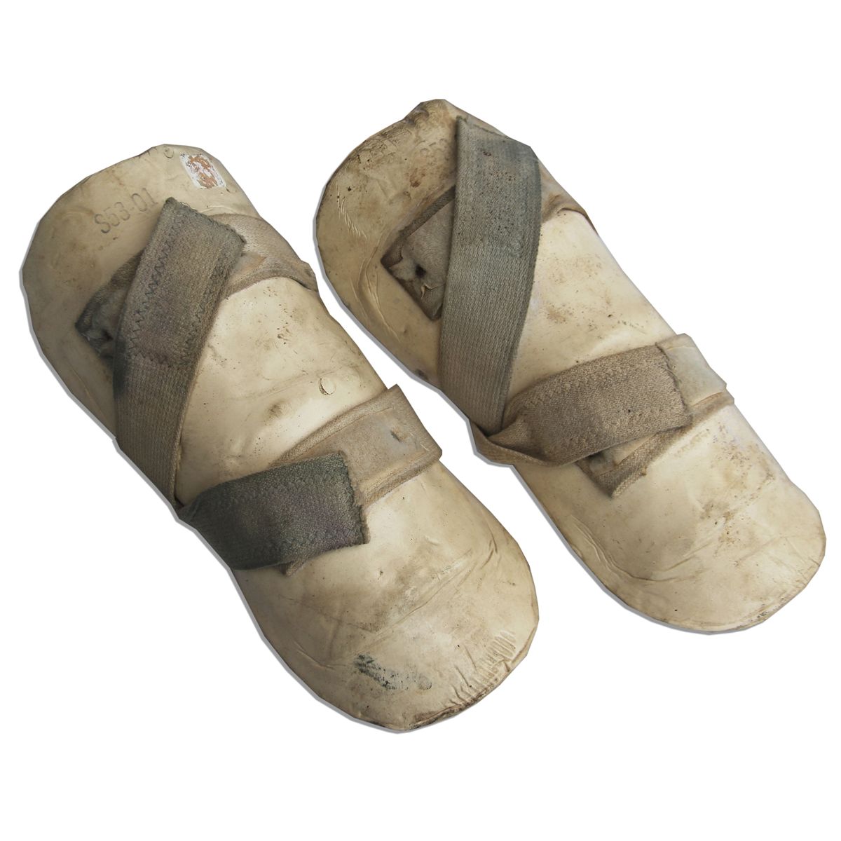 Bruce Lee personally owned and used pair of shin guards from training in his proprietary martial arts philosophy, Jeet Kune Do. Shin guards are secured across the calf with two adjustable cloth straps and fasten with velcro. Curved guards measure 11'' in length by 4'' across. Light soiling and denting to edges, else near fine. From among the training equipment Lee gifted to Herb Jackson upon his move to Hong Kong. Jackson is well-documented as a builder of Lee's custom martial arts training equipment, a task he undertook as Lee's first generation Jeet Kune Do student and friend. With a COA from Jackson's son.