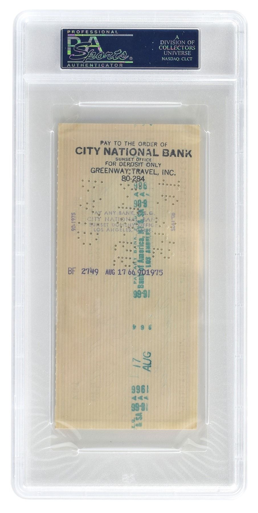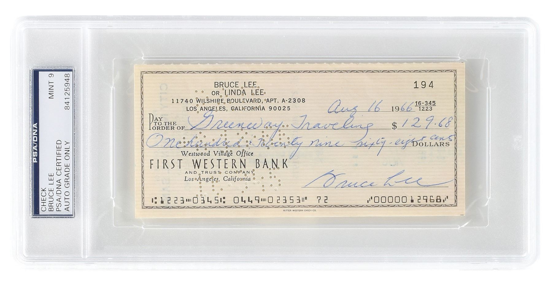 Personal check, 6 x 2.75, filled out and signed by Lee, "Bruce Lee," payable to Greenway Traveling for $129.68, August 16, 1966. Encapsulated by PSA/DNA, with the crisp signature graded "MINT 9." In fine condition. Lee was living in a tiny apartment on Wilshire Boulevard in Westwood, California, preparing for his television debut on The Green Hornet, when he wrote this check. Producer William Dozier was so impressed by Lee's audition for the scrapped show Number One Son, that he cast Lee as Van Williams' crime-fighting sidekick Kato. Although The Green Hornet was canceled after a single season, Lee's iconic portrayal of Kato enabled the actor to make three crossover appearances on the wildly popular live action Batman series between 1966 and 1967.