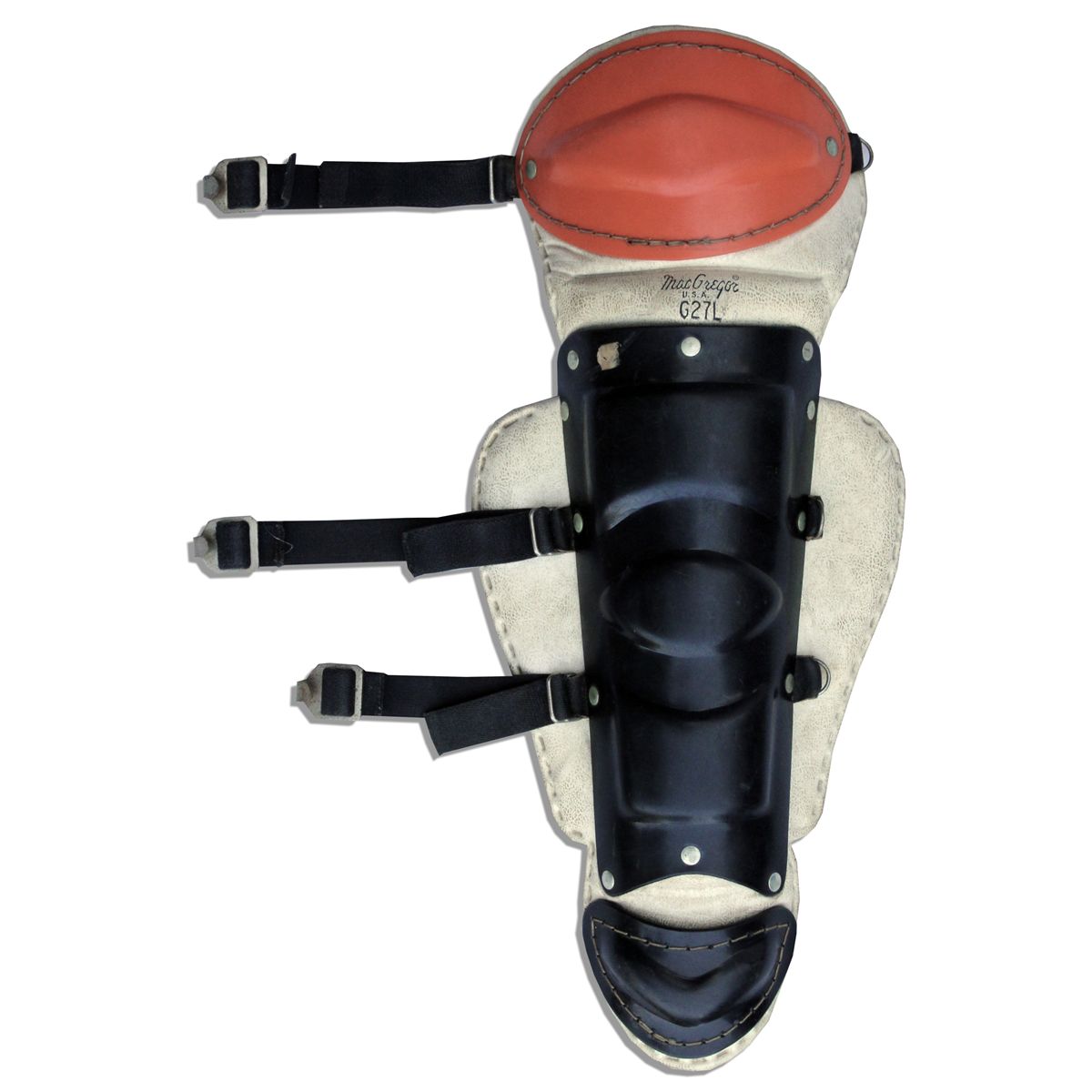 Bruce Lee personally owned and used shin guard from the training in his proprietary martial arts philosophy, Jeet Kune Do. Shin guard by MacGregor brand is solidly constructed of padded white leather and fastens across the calf with two adjustable cloth straps. Outer portion features a shell of heavy plastic in three separate pieces to protect the shin and knee. Shin guard measures 21'' in length by 9'' across at its widest point. Light soiling, else near fine. From among the training equipment Lee gifted to Herb Jackson upon his move to Hong Kong. Jackson is well-documented as a builder of Lee's custom martial arts training equipment, a task he undertook as Lee's first generation Jeet Kune Do student and friend. With a COA from Jackson's son.