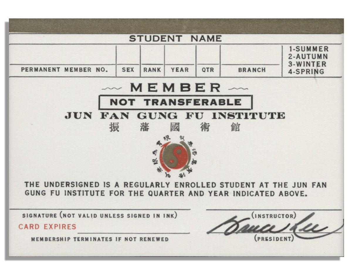 Printed ''gold stripe'' membership card signed by ''Bruce Lee'' as President of his first U.S. martial arts school, the Jun Fan Gung Fu Institute. In 1959 Lee began teaching martial arts in the United States while an undergrad at the University of Washington, founding his first school, Jun Fan Gung Fu (literally Bruce Lee's Kung Fu) in Seattle. This evolved into his most well-known school of martial arts, ''Jeet Kune Do,'' also known as ''JKD,'' which he founded in 1967. Front of card has ''Jun Fan Gung Fu Institute'' printed in both English and Chinese. Also with a red and gold yin/yang symbol defining the school's philosophy, ''Using No Way As Way / Having No Limitation As Limitation''. Card measures 3.75'' x 2'' and is blank save for Lee's signature. Fine. With a COA from Taky Kimura, a former student of Lee's who became head instructor of Seattle's Jun Fan Gung Fu Institute: ''I, Taky Kimura, state that Bruce Lee, my late and great friend…signed this Jun Fan Gung Fu Institute Card…I have had in my possession for over 40 years…''