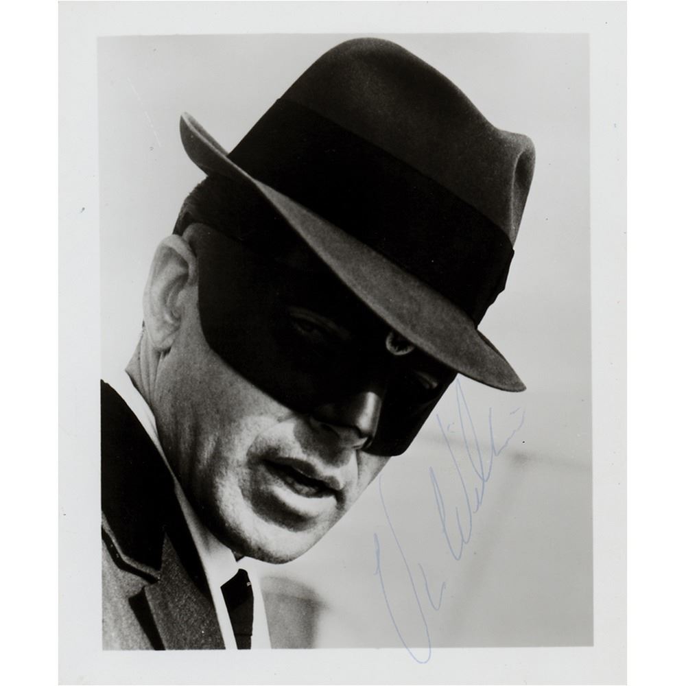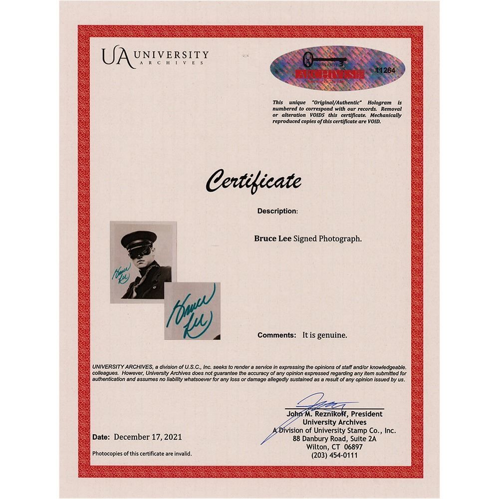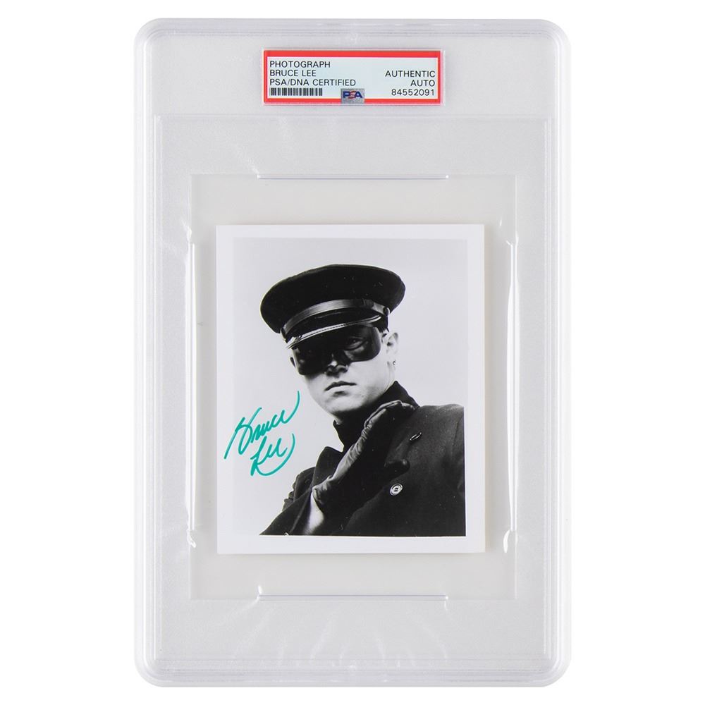 Vintage glossy 4 x 5 photo of Lee as Kato from The Green Hornet television series, boldly signed in green felt tip, "Bruce Lee." In very fine condition. Encapsulated in a PSA/DNA authentication holder and accompanied by a full letter of authenticity from University Archives. Also includes a matching vintage glossy 4 x 5 photo of his co-star Van Williams, signed in blue ballpoint.