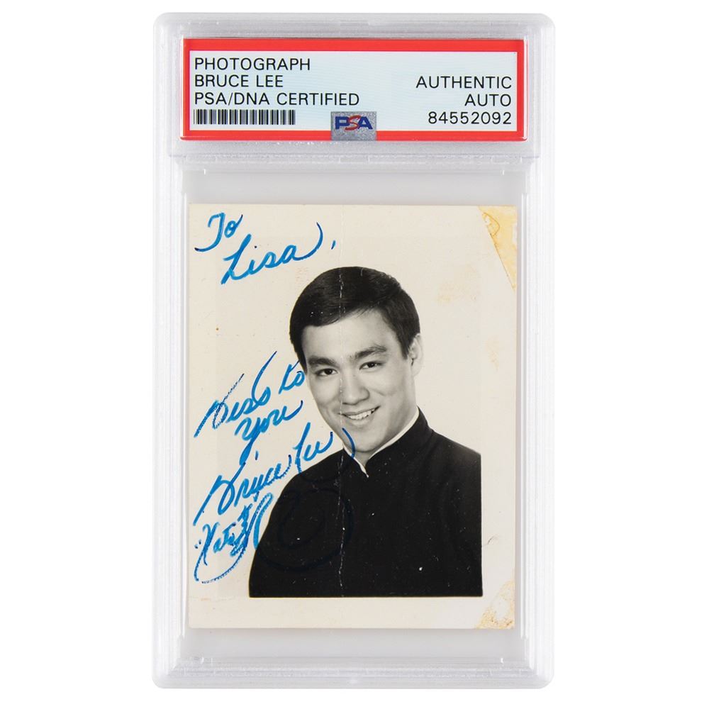 Vintage glossy 2.5 x 3.25 head-and-shoulders photo of the legendary martial artist, signed and inscribed in black felt tip, "To Lisa, Bless to you, Bruce Lee," adding his 'Loong' character below his signature, which represents the Chinese character of a dragon. In very good condition, with a central vertical crease, old tape stains to two corners, and a tiny tear to the lower left corner. Encapsulated in a PSA/DNA authentication holder.