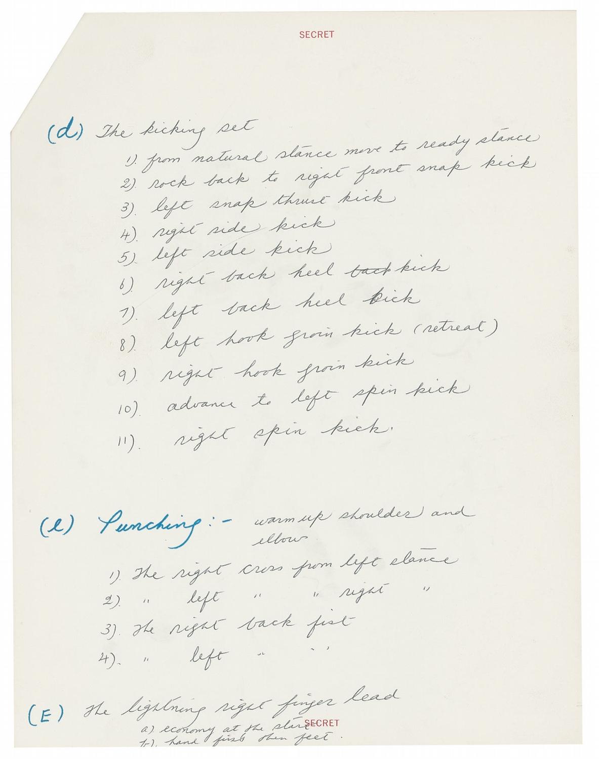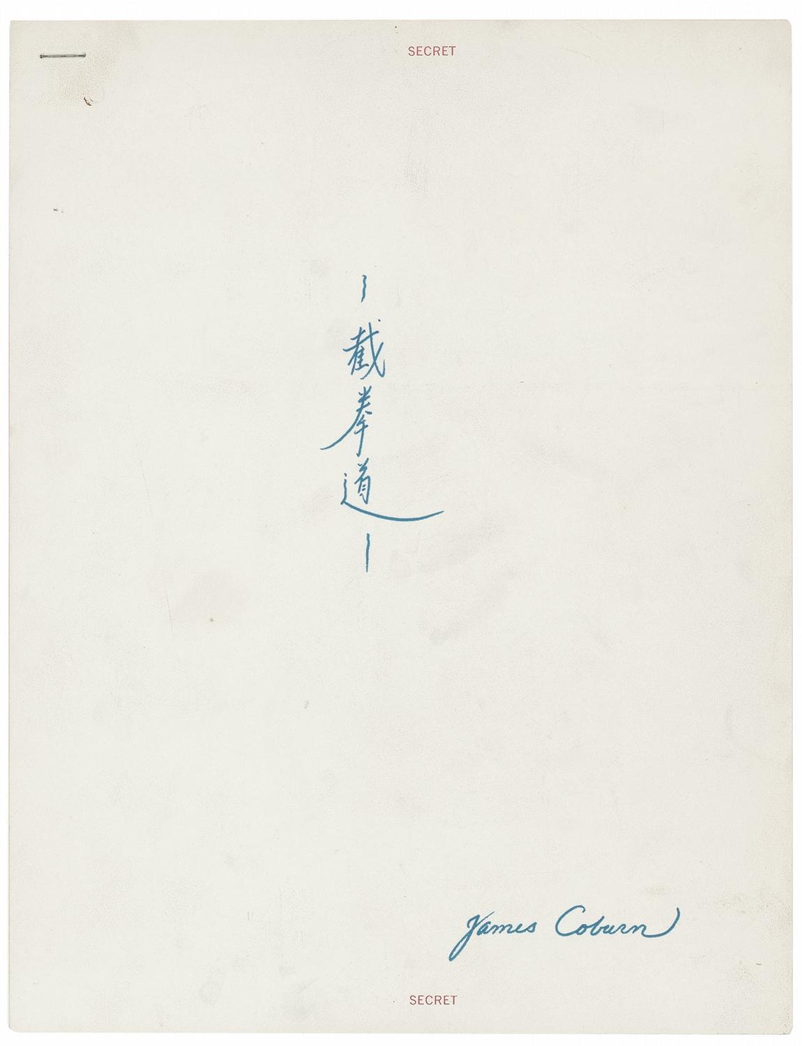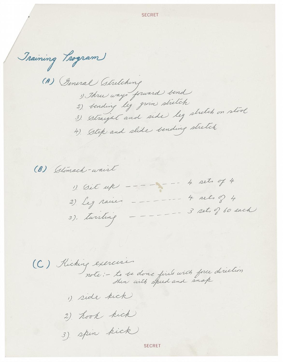 Very rare unsigned handwritten Jeet Kune Do training program developed by Bruce Lee for one of his students, actor James Coburn! Listed on two heavy stock grained 8.5 x 11 sheets are 25 specific exercises, with “SECRET” printed at the top of each page. The cover page has “Jeet Kune Do” (in Chinese) and “James Coburn” both in Lee’s hand. For the instr uctions, Lee writes: First page: "Training Program (A) General stretching. 1). three ways forward bend 2). bending leg groin stretch 3). straight and side leg stretch on stool 4). step and slide bending stretch (B) stomach-waist 1). sit up ----- 4 sets of 4 2). leg raise ----- 4 sets of 4 3). twisting ----- 3 sets of 60 each (C) Kicking exercise note: to be done first with force direction then with speed and snap 1). side kick 2). hook kick 3). spin kick." Second page: "(d) The kicking set 1). from natural stance move to ready stance 2). rock back to right front snap kick 4). right side kick 5). left side kick 6). right back heel ['back' crossed out] kick 7). Left back heel kick 8). left hook groin kick (retreat) 9). right hook groin kick 10). advance to left spin kick 11). right spin kick. (e) Punching: warm up shoulder and elbow 1). The right cross from left stance 2). " [The] left " " [cross from] right " [stance] 3). The right back fist 4). " [The] left " " [back fist] (E) The lightning right finger lead a). economy at the start b). hand first then feet.” In fine condition, with some mild handling wear and creasing, staple to top left corner, as well as a few scattered light spots.