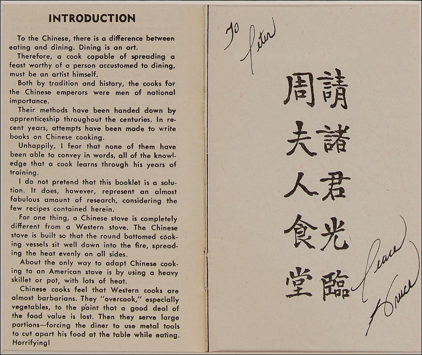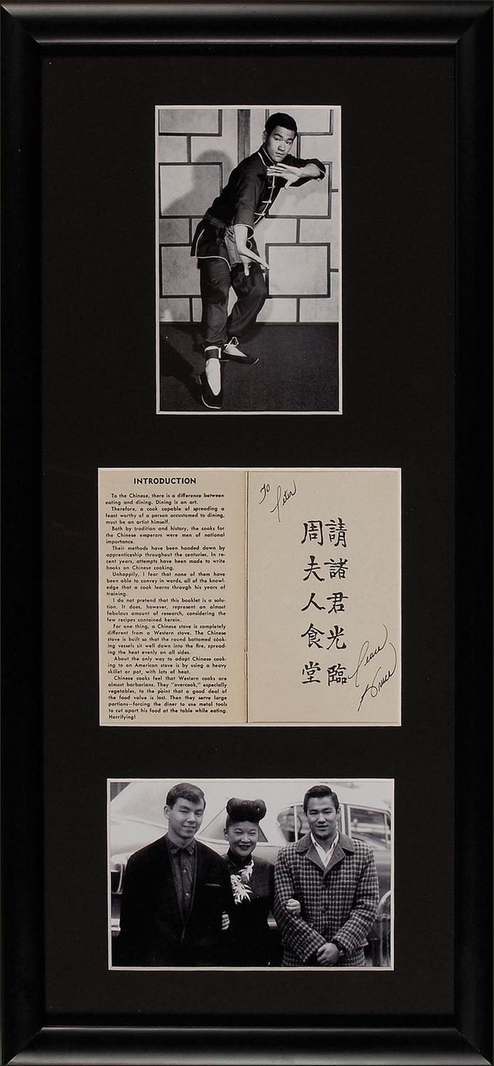Fully intact original cookbook booklet, circa early 1960s, 5.5 x 4.5, from Ruby Chow’s Chinese restaurant in Seattle, Washington. Left page of booklet bears a printed introduction, with the right page bearing Chinese characters which loosely translate to a welcome and invitation from Ruby Chow to dine at her restaurant. Signed on the right page in black ink, “To Peter, Peace, Bruce.” The recipient in all likelihood is Lee’s brother Peter. Matted and framed by a photo of Bruce and his brother Peter posing with Chow, and a photo of Lee demonstrating his martial arts inside her restaurant, to an overall size of 9 x 19. In fine condition, with a uniform shade of mild toning. Upon Lee’s move to Seattle from Hong Kong in 1959, he worked for Ruby Chow as a waiter and lived in quarters above her restaurant. In fact, many of Lee’s early gung fu photos were shot in the parking lot and inside her establishment. An early and interesting example from Lee as he begins his new life in America.