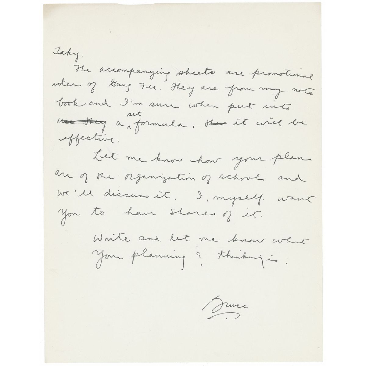 ALS signed “Bruce,” one page, 8.5 x 11, no date. Letter to Taky Kimura, his prize student and eventually one of only three Lee-certified instructors of Jeet Kune Do. In full: “The accompanying sheets are promotional ideas of Gung Fu. They are from my note book and I’m sure when put into a set formula, it will be effective. Let me know how your plans are of the organization of schools and we’ll discuss it. I, myself, want you to have shares of it. Write and let me know what your planning & thinking is.” In fine condition, with creasing along the left side and a small spot of toning to top left corner.