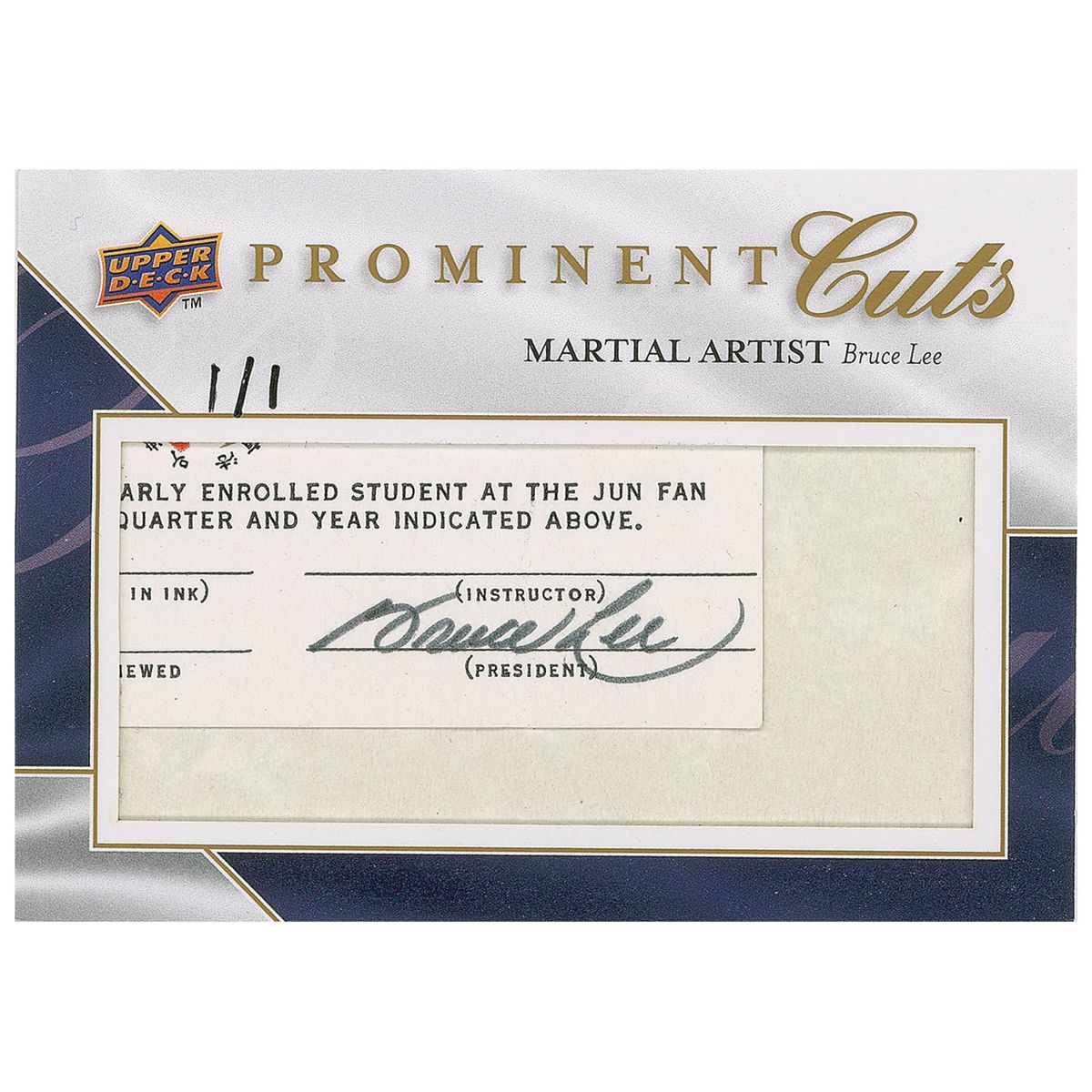 Ink signature, “Bruce Lee,” on an off-white 2 x 1 slip, clipped from a Jun Fan Gung Fu Institute card. Card is permanently affixed to a mount and matted as part of Upper Deck’s Prominent Cuts series, to an overall size of 3.5 x 2.5. In fine condition.