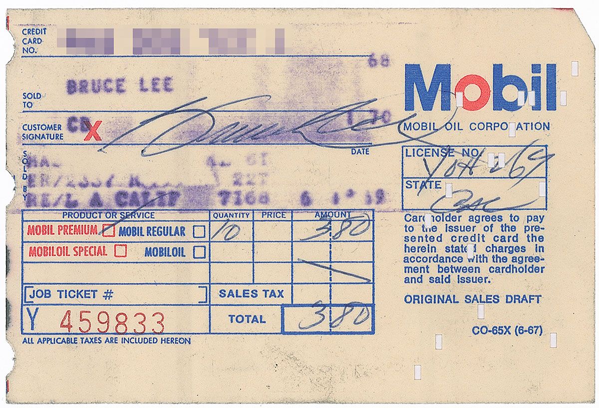 DS one page, 5 x 3.25, June 1, 1969. Credit card receipt for a $3.80 gas purchase (10 gallons at 38¢ per gallon) at a Mobil station in Los Angeles, signed in ballpoint by Lee. In fine condition, with mild soiling from carbon and expected punch holes.