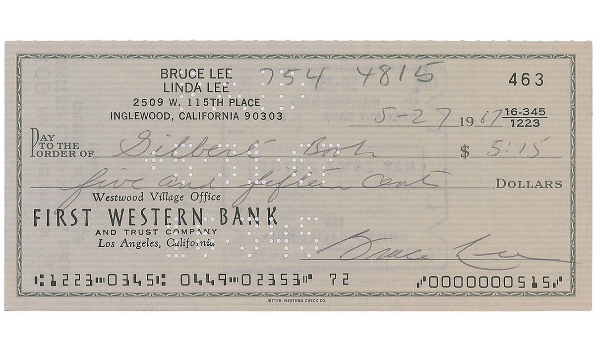 Uncommon personal check, 6 x 2.75, filled out and signed by Lee, payable to Gilbert Book for $5.15, May 27, 1967. In fine condition, with cancellation holes to body and some light show-through from stamps on reverse. A seldom-seen and extremely desirable format.