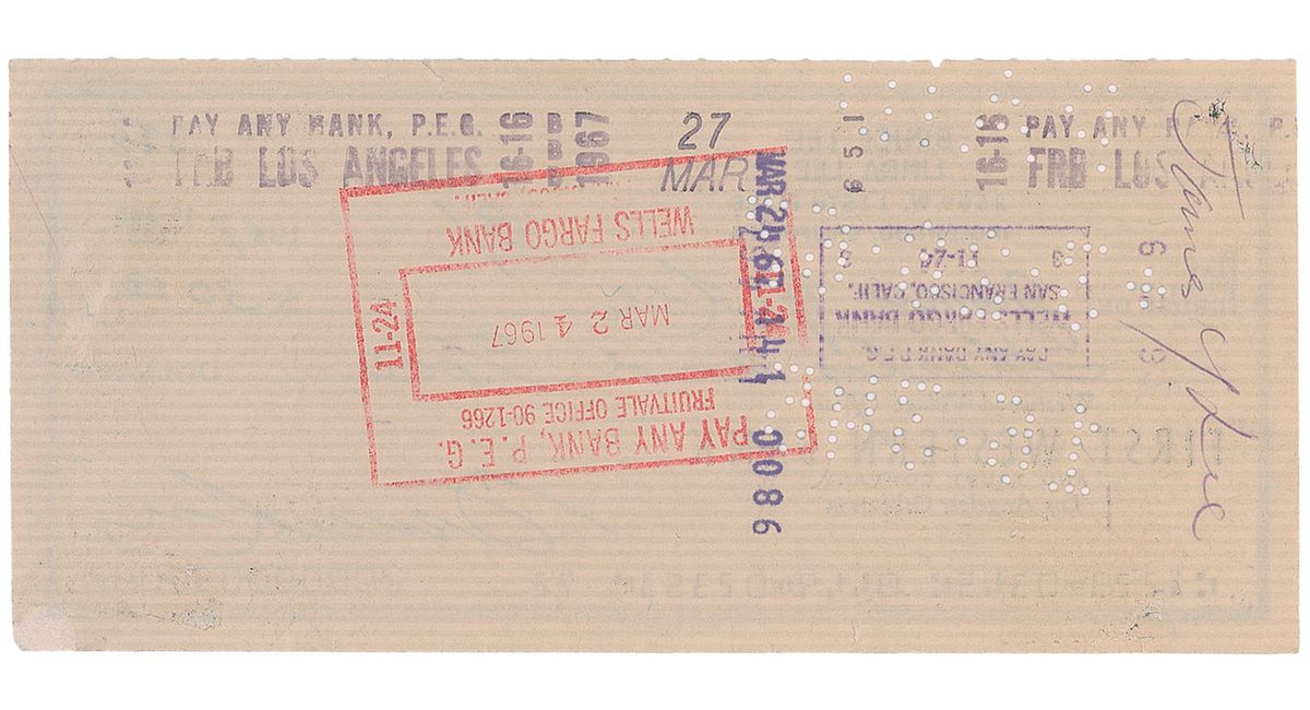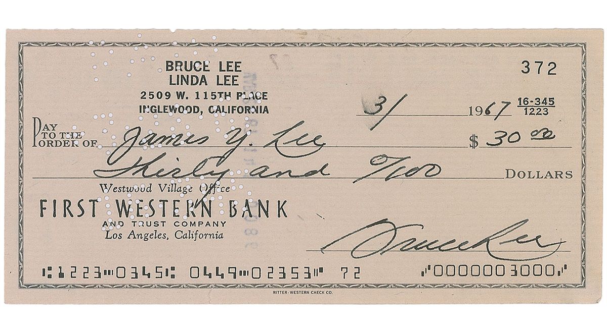 Scarce personal check, 6 x 2.75, filled out and signed by Lee, “Bruce Lee,” payable to James Y. Lee for $30, March 1967. Endorsed on the reverse by James Y. Lee. In fine condition, with expected cancellation holes (far from and not affecting the signature) and trivial brushing to the date. The recipient, James Yimm Lee, was an important martial arts pioneer who was a mentor, teacher, and friend of Bruce Lee. The two men lived and trained together in the early 1960s, and their mutual collaboration evolved into the now-famous fighting art known as Jeet Kune Do. James Yimm Lee was responsible for introducing Bruce Lee to Ed Parker, the organizer of the Long Beach International Karate Championships where Lee would be ‘discovered’ by Hollywood in 1964. Lee autographic material is exceedingly scarce, and rarely found with such an important personal association.
