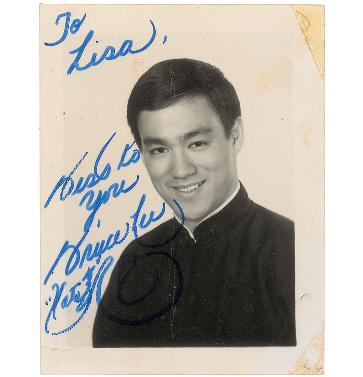 Incredibly rare glossy 2.5 x 3.25 head-and-shoulders photo of Lee smiling, signed and inscribed in blue felt tip, “To Lisa, Kiss to you, Bruce Lee, ‘Kato’.” In very good condition, with a creased central vertical fold, tiny edge tear below the signature, and toned tape remnants to two corners. Lee played Kato in the Green Hornet television series, which aired for the 1966–67 season; the show became a hit in Lee’s native Hong Kong, where it became known as ‘The Kato Show.’ An exceedingly rare format, this is the first Lee signed photo we have offered in 15 years.