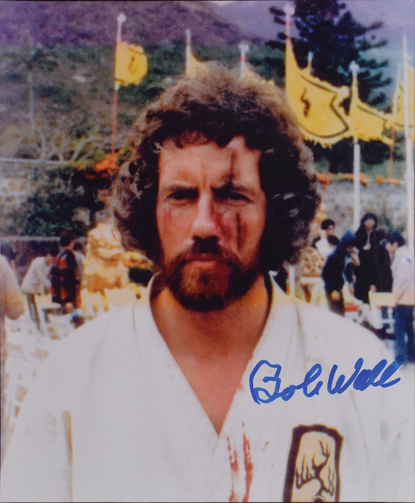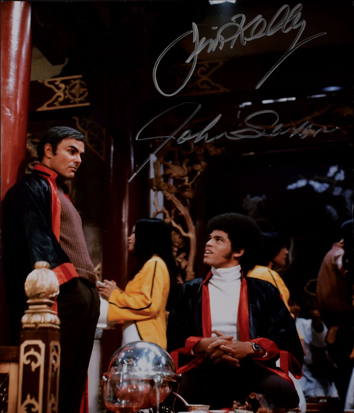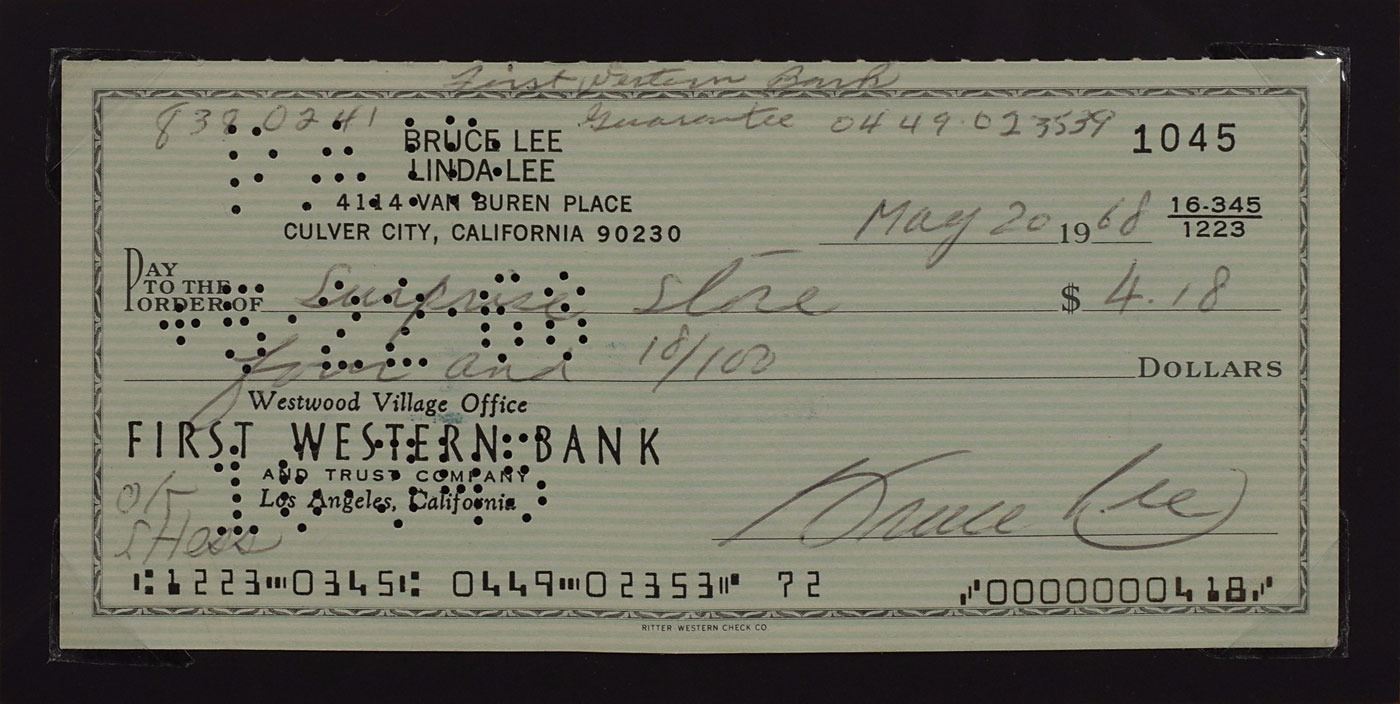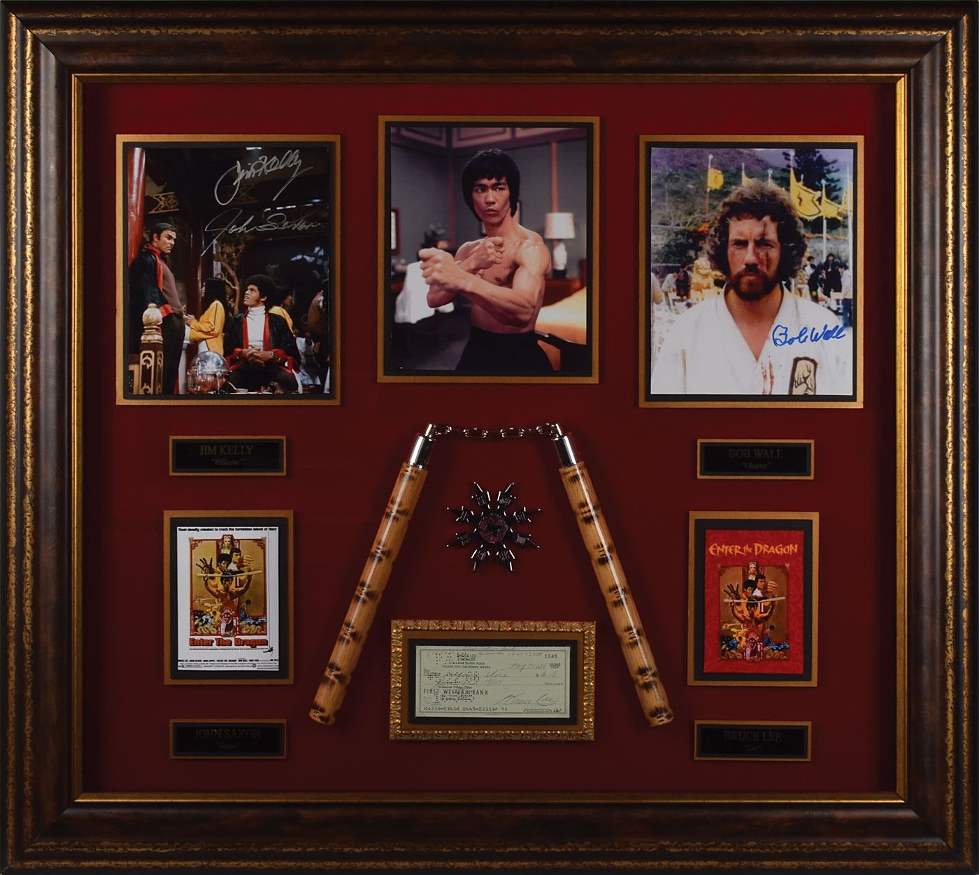Sought-after personal check, 6 x 2.75, filled out and signed by Bruce Lee, payable to Surprise Store for $4.18, May 20, 1968. Bank notations to upper border and lower left in another hand. Expertly mounted and framed with a pair of nunchaku, a shuriken, two small images of the Enter the Dragon movie poster, four nameplates, a photo of Lee from the film, and two photos signed by actors Jon Saxon, Jim Kelly, and Bob Wall, to an overall size of 38 x 34. In fine condition. Although The Green Hornet was canceled after a single season, Lee's iconic portrayal of Kato enabled the actor to make three crossover appearances on the wildly popular live action Batman series between 1966 and 1967. Lee worked in television for a few more years before landing a leading role in The Big Boss, a martial arts action film that not only elevated Lee's popularity across all of Asia, but likewise paved the way for Enter the Dragon, Lee's final and most enduring motion picture.