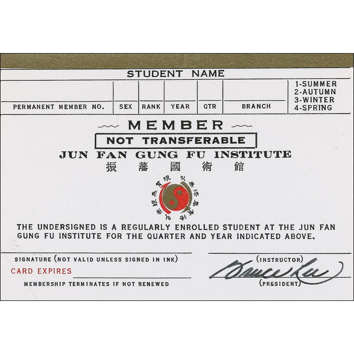 Unissued ‘gold stripe’ membership card for Lee’s Jun Fan Gung Fu Institute, 3.75 x 2.5, signed in black ink “Bruce Lee.” In rejecting many components of traditional martial arts and adopting a more inclusive, holistic approach, Lee developed a system he originally called “Jun Fan Gung Fu,” a name that incorporated the Chinese form of his own name, Lee Jun Fan. Lee summed up the underlying philosophy of his style, later renamed Jeet Kune Do (“The Way of the Intercepting Fist”), as “simply the direct expression of one’s feelings with the minimum of movements and energy.” Lee operated a number of schools based on his methods until 1971, though he permitted his students to carry on his teachings on a private basis. The logo for the system, which appears on the card, incorporates a yin-yang symbol with Chinese characters indicating the principles “Using no way as way” and “Having no limitation as limitation,” along with arrows representing the endless movement and change of the universe. In excellent, pristine condition. As handsome and well-preserved a Lee item as you’re ever likely to encounter!