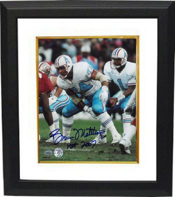 Bruce Matthews played offensive guard and center in the National Football League (NFL) for 19 seasons during the 1980s, 1990s, and 2000s. He was selected in the first round of the 1983 NFL Draft, played professionally for the NFL's Oilers/Titans franchise, and was a 14-time Pro Bowl selection, the most in NFL history, a record shared with Merlin Olsen, Tony Gonzalez, and Peyton Manning. A 2007 inductee into the Pro Football Hall of Fame, Matthews is the brother of All-Pro linebacker Clay Matthews, Jr., and uncle of All-Pro linebacker Clay Matthews III. Bruce Matthews has hand signed this Houston Oilers 8x10 Photo with HOF 2007 inscription. Matthews Hologram and Certificate of Authenticity from Athlon Sports Collectibles. Custom White Mat and Premium Black Color Framed as shown.