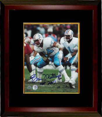 Bruce Matthews played offensive guard and center in the National Football League (NFL) for 19 seasons during the 1980s, 1990s, and 2000s. He was selected in the first round of the 1983 NFL Draft, played professionally for the NFL's Oilers/Titans franchise, and was a 14-time Pro Bowl selection, the most in NFL history, a record shared with Merlin Olsen, Tony Gonzalez, and Peyton Manning. A 2007 inductee into the Pro Football Hall of Fame, Matthews is the brother of All-Pro linebacker Clay Matthews, Jr., and uncle of All-Pro linebacker Clay Matthews III. Bruce Matthews has hand signed this Houston Oilers 8x10 Photo with HOF 2007 inscription. Matthews Hologram and Certificate of Authenticity from Athlon Sports Collectibles. Custom Black Mat and Premium Mahogany Color Framed as shown.