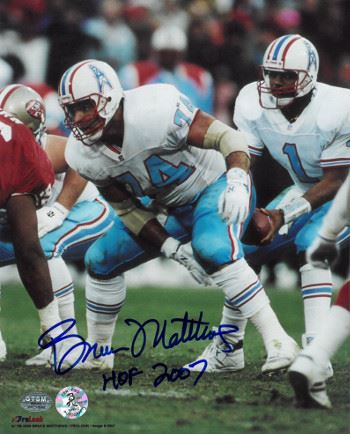 Bruce Matthews played offensive guard and center in the National Football League (NFL) for 19 seasons during the 1980s, 1990s, and 2000s. He was selected in the first round of the 1983 NFL Draft, played professionally for the NFL's Oilers/Titans franchise, and was a 14-time Pro Bowl selection, the most in NFL history, a record shared with Merlin Olsen, Tony Gonzalez, and Peyton Manning. A 2007 inductee into the Pro Football Hall of Fame, Matthews is the brother of All-Pro linebacker Clay Matthews, Jr., and uncle of All-Pro linebacker Clay Matthews III. Bruce Matthews has hand signed this Houston Oilers 8x10 Photo with HOF 2007 inscription. Matthews Hologram and Certificate of Authenticity from Athlon Sports Collectibles.