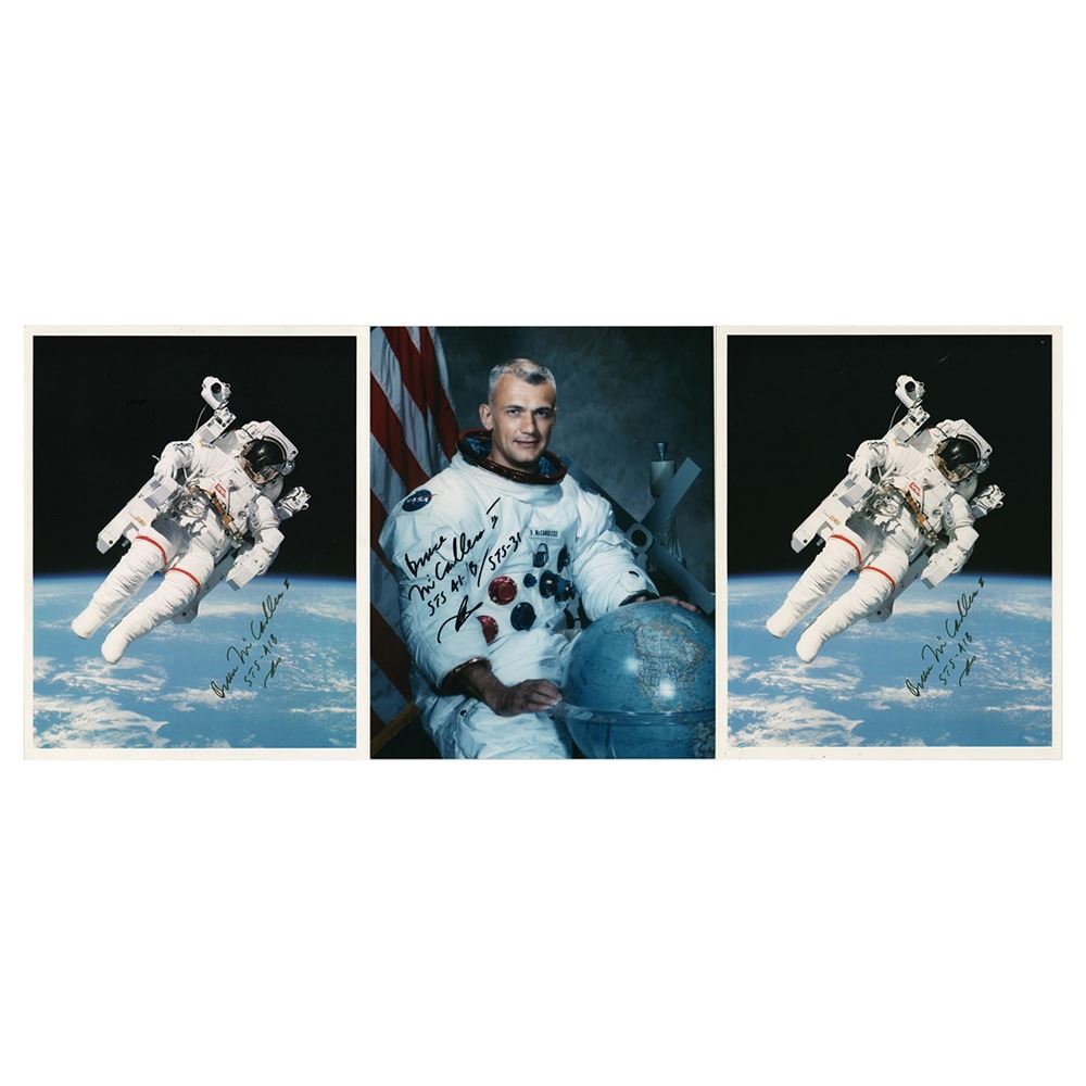 Three photos: two identical color 8 x 10 Lockheed Martin cardstock photos of McCandless's historic first untethered free flight, signed in black felt tip, "Bruce McCandless II, STS-41-B"; and a color glossy 8 x 10 photo of McCandless in his white space suit, signed in black felt tip, "Bruce McCandless II, STS41-b/STS-31." In overall very good to fine condition, with creasing to both cardstock photos, and a small corner tear to one of them.