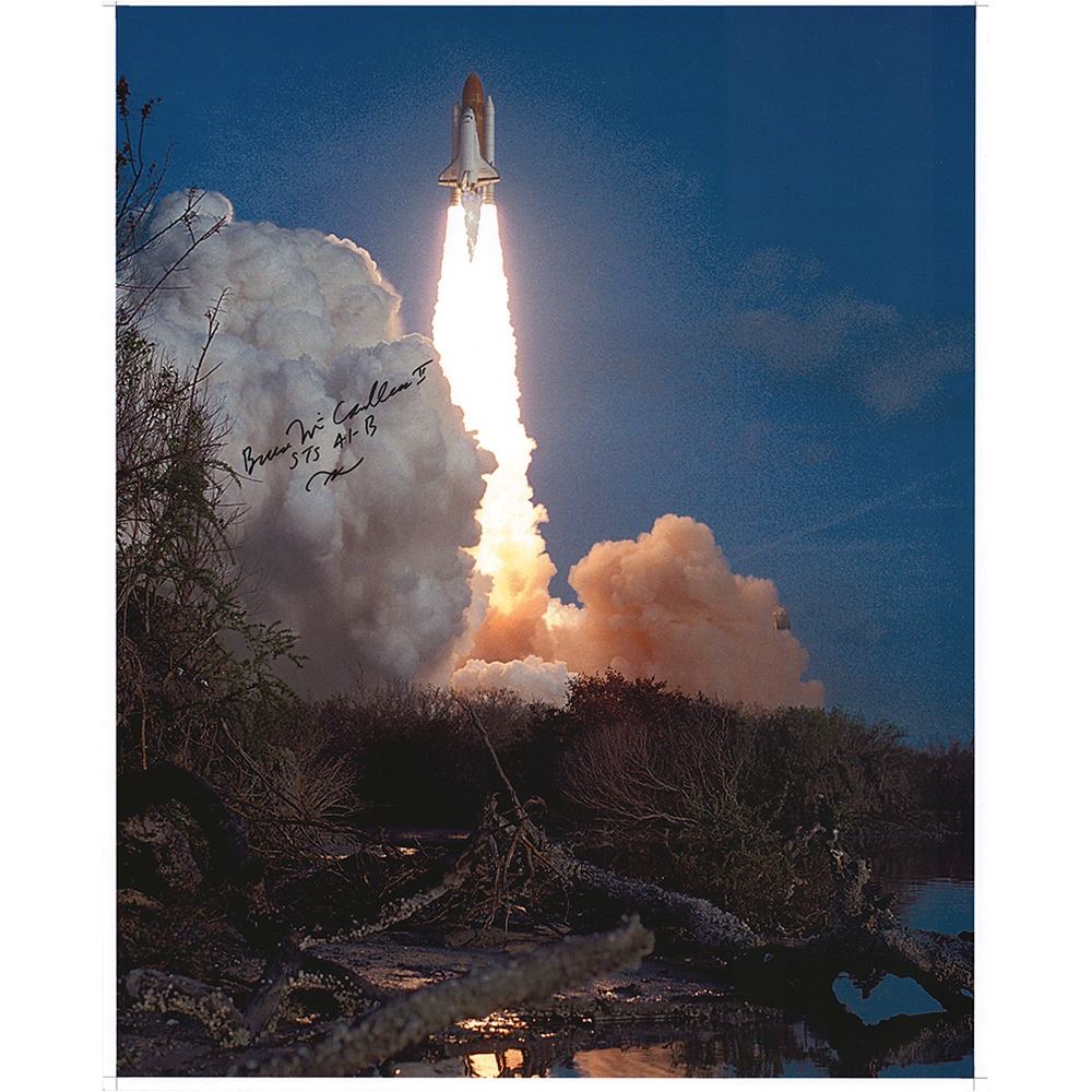 Color satin-finish 16.5 x 20.25 photo of the launch of the STS-41-B mission on February 3, 1984, signed in black felt tip, “Bruce McCandless II, STS 41-B.†In fine condition, with scattered small surface creases. This STS-41-B mission marked the first checkout of the MMU and Manipulator Foot Restraint. McCandless made the first untethered free flight on each of the two MMUs carried on board, thereby becoming the first person to make an untethered spacewalk.