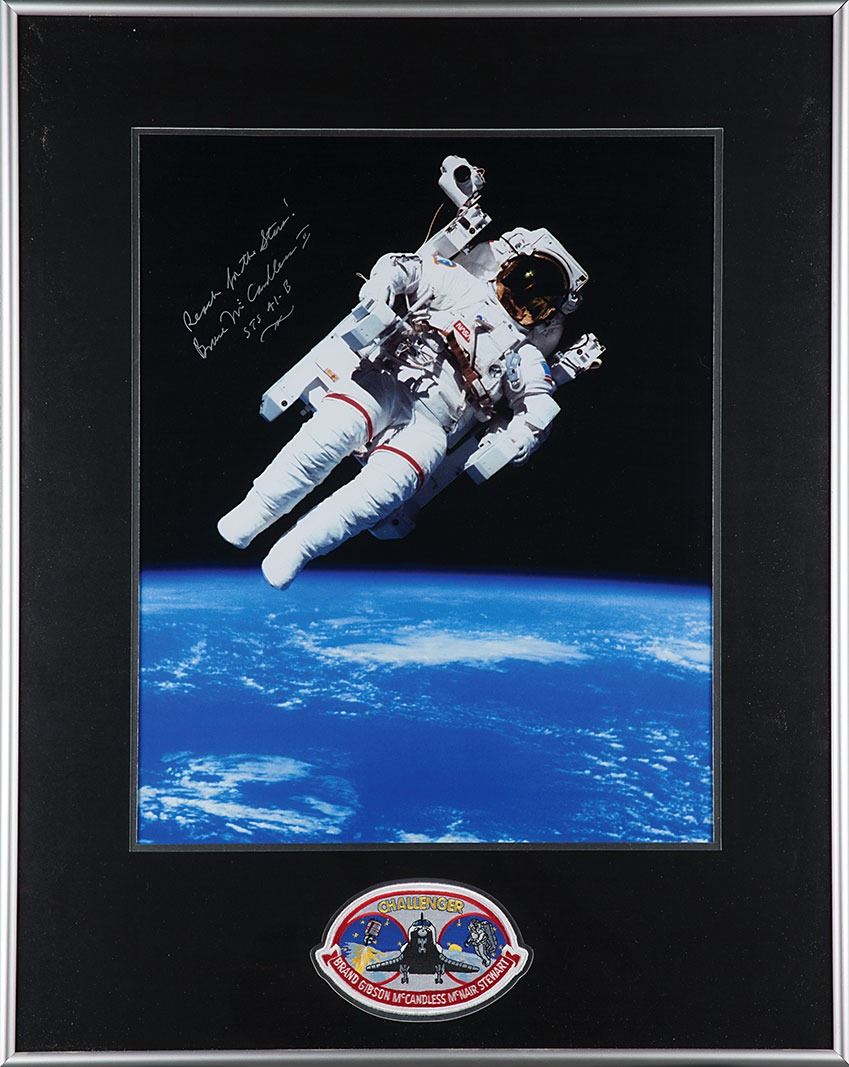 Beautiful color satin-finish 15.5 x 19.5 full-length photo of McCandless performing his historic first untethered free flight, signed in silver ink, "Reach for the Stars! Bruce McCandless II, STS 41-B." Double-matted and framed with an embroidered STS 41-B mission patch to an overall size of 22.75 x 29.25. In very fine condition. Accompanied by a certificate of authenticity from Astronaut Central.