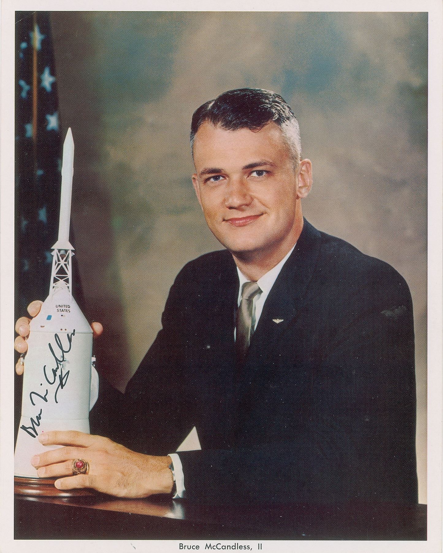 Scarce official color 8 x 10 NASA lithograph of McCandless posing with a model of an Apollo command/service module in a formal half-length pose, signed in black felt tip. In fine condition, with a couple of small scuffs. A member of Astronaut Group 5, McCandless served as a mission control capsule communicator (CAPCOM) on Apollo 11 during the first lunar moonwalk—years later he etched his own name into the history books when he performed the first untethered free flight during the STS-41-B mission.