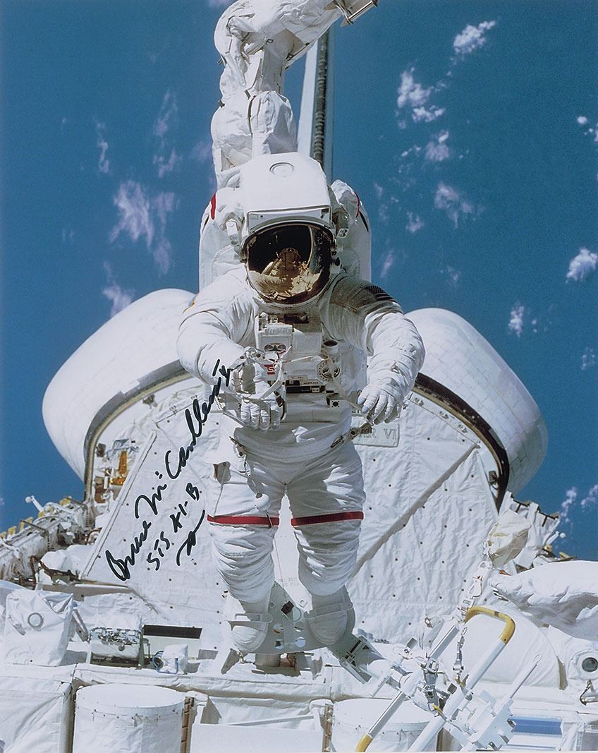 Superb color semi-glossy 8 x 10 full-length photo of mission specialist McCandless walking above the Challenger payload bay, signed in black felt tip, "Bruce McCandless II, STS 41-B." In fine condition, with a few light surface creases.