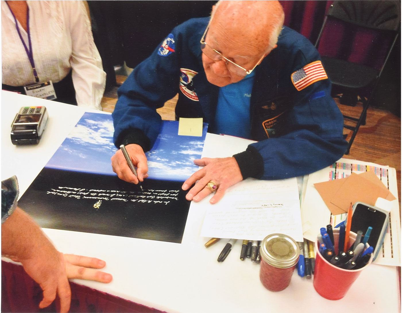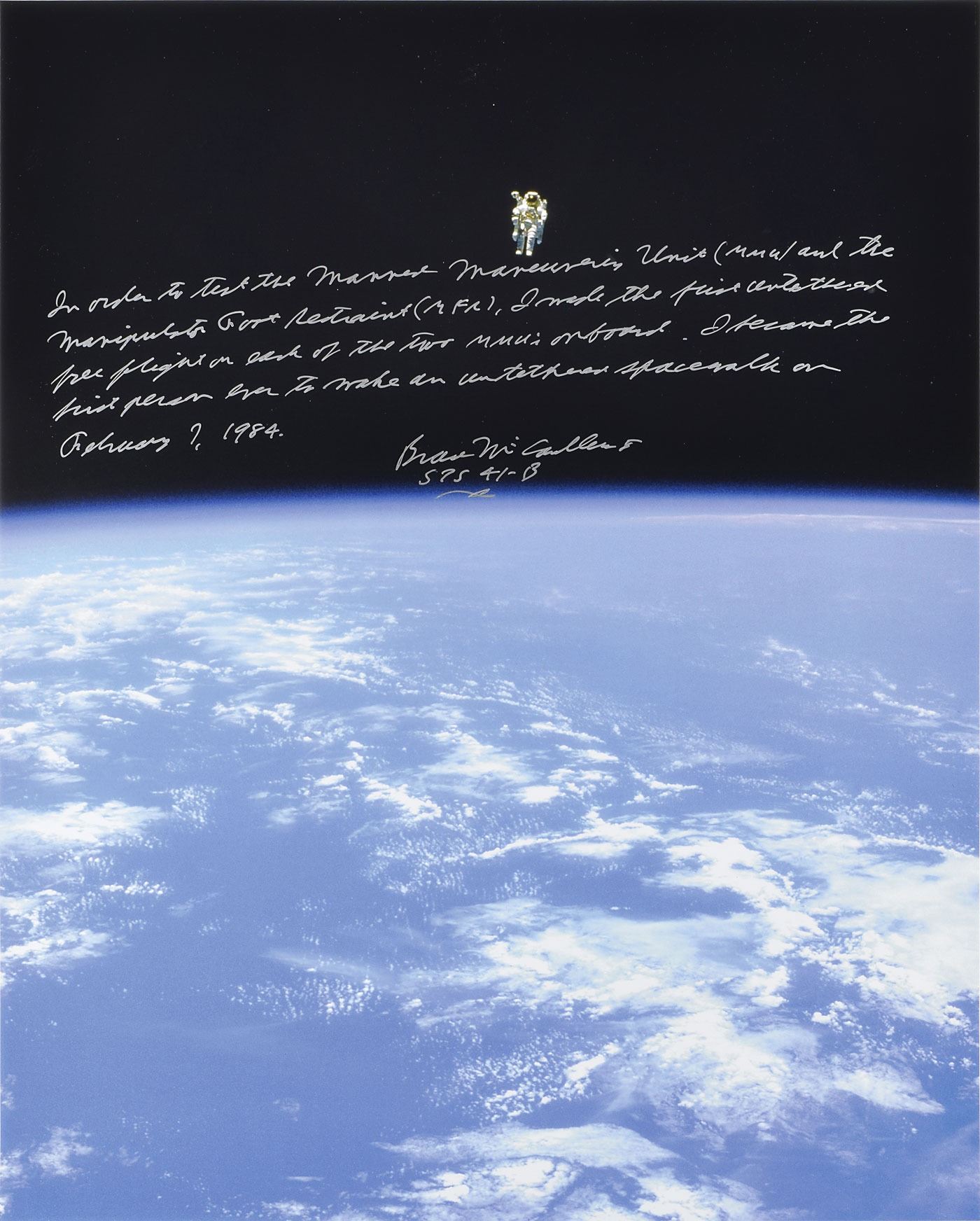 Wonderful color semi-glossy 16 x 20 photo of McCandless floating in space during his STS–41-B mission, signed nicely against the dark background in silver ink, "Bruce McCandless II, STS 41–B," who adds a lengthy inscription above: "In order to test the Manned Maneuvering Unit (MMU/ and the Manipulation Foot Restraint (MFR), I made the first untethered free flight on each of the two MMUs onboard. I became the first person ever to make an untethered spacewalk on February 7, 1984." In fine condition. Accompanied by a photo of McCandless taken at the time of signing.