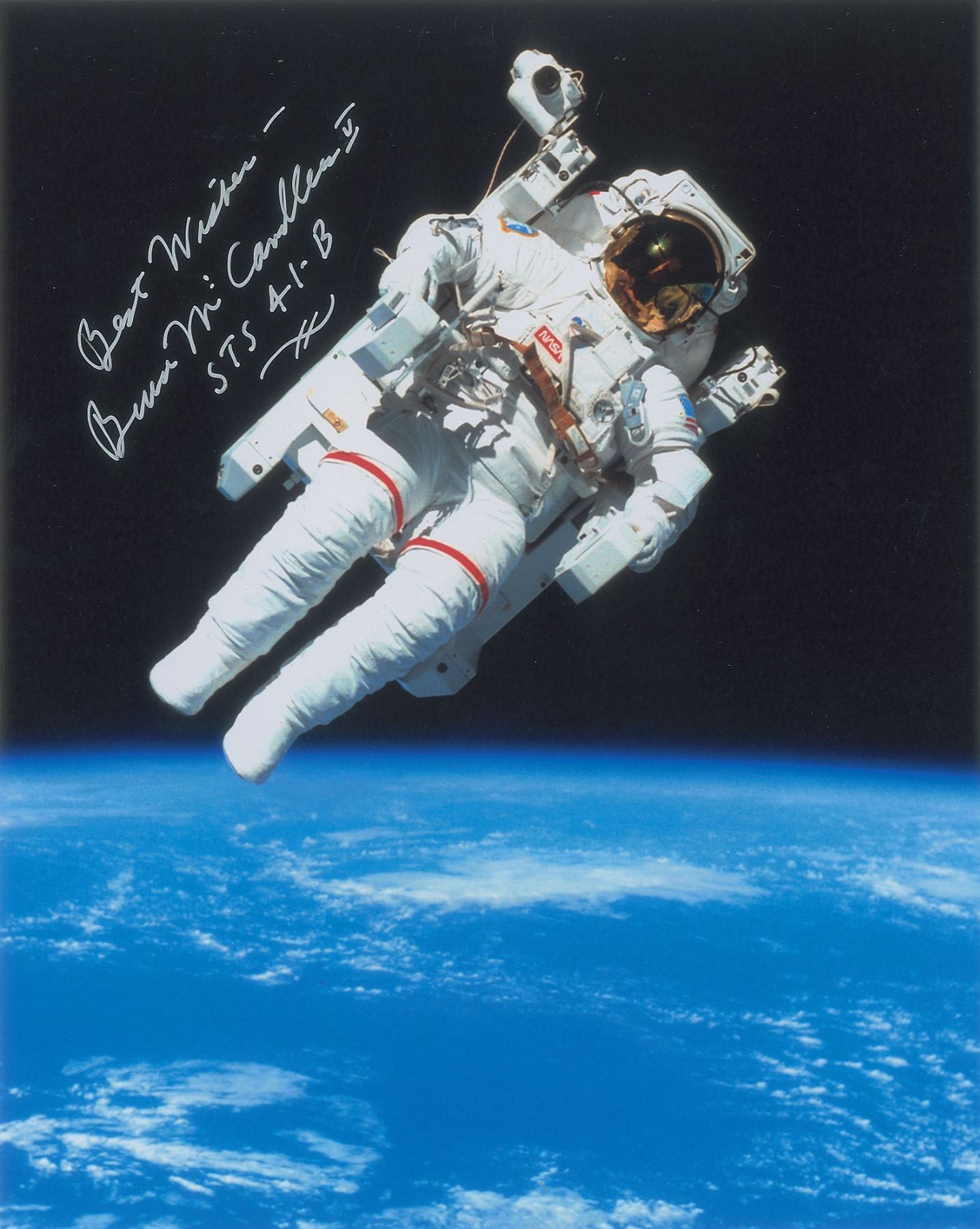 Gorgeous color satin-finish 8 x 10 full-length photo of McCandless performing his historic first untethered free flight, signed neatly in silver ink, "Best wishes—Bruce McCandless II, STS 41–B." In very fine condition.