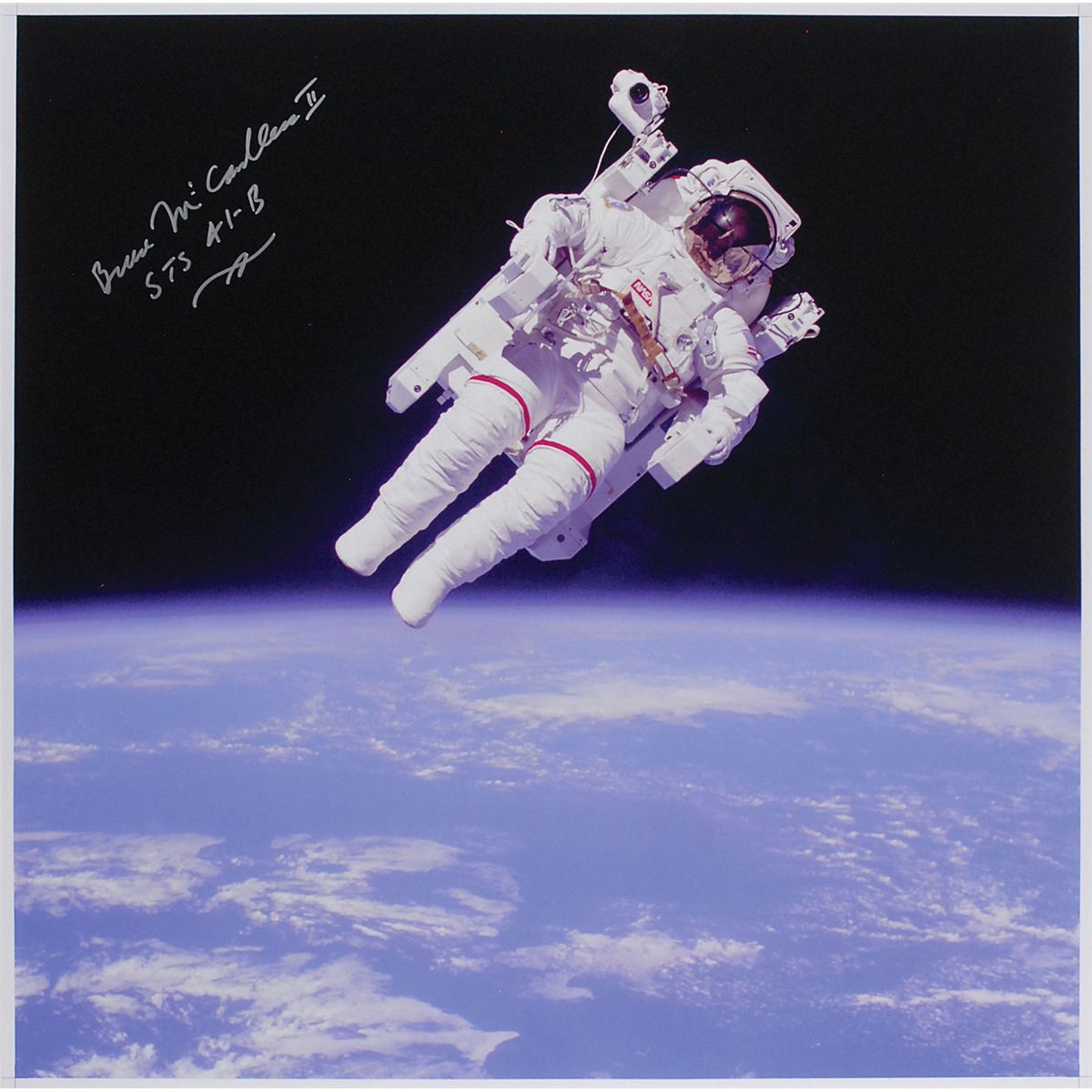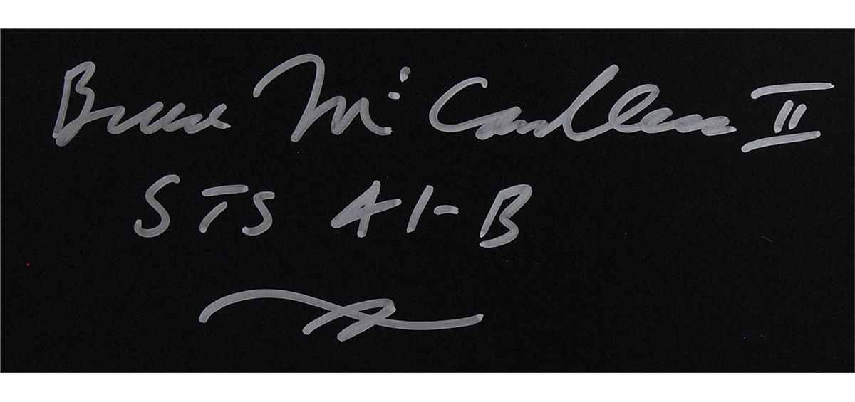 Oversized color satin-finish 20.5 x 20.5 photo of McCandless performing his historic EVA, signed in silver ink, “Bruce McCandless. STS-41B.” In fine condition.