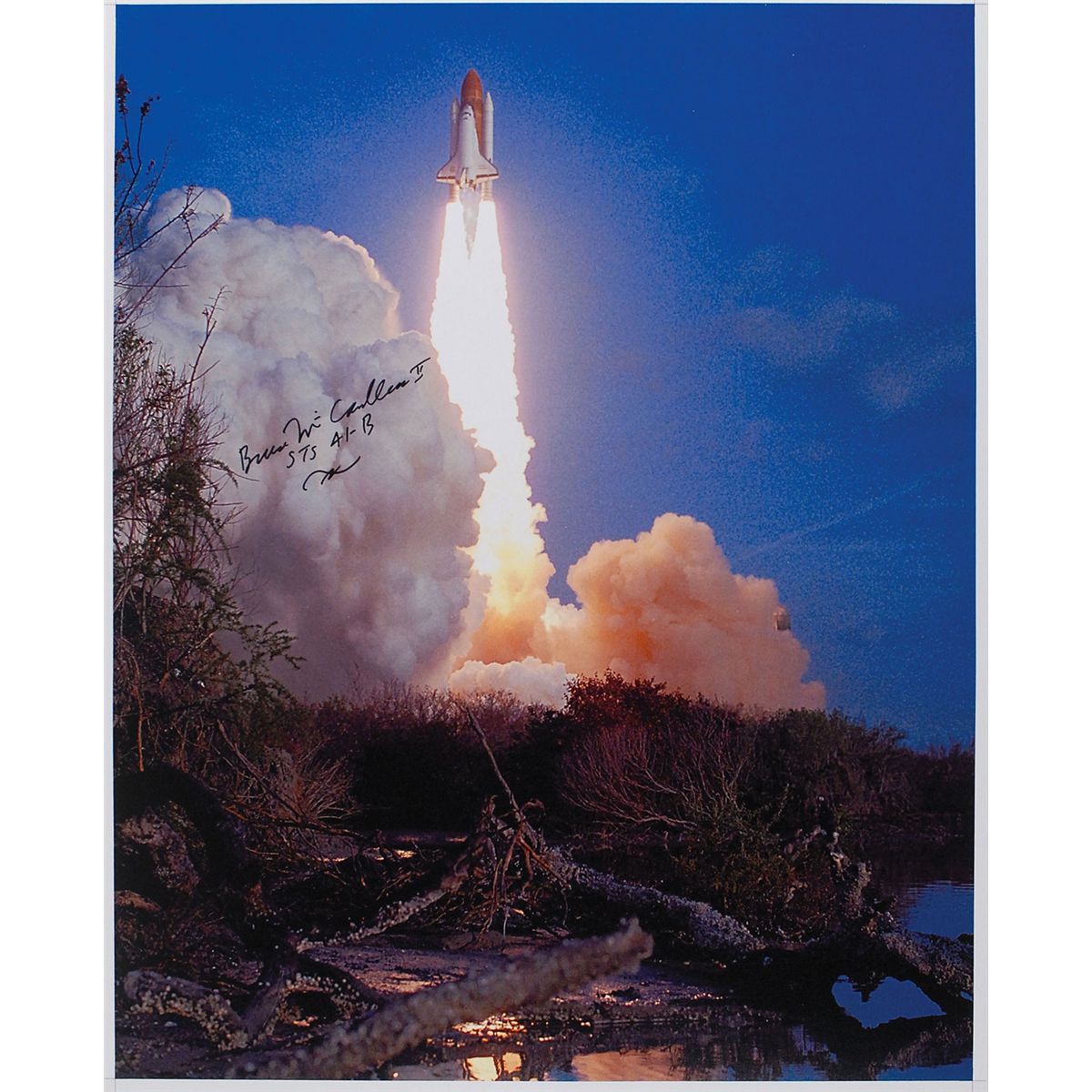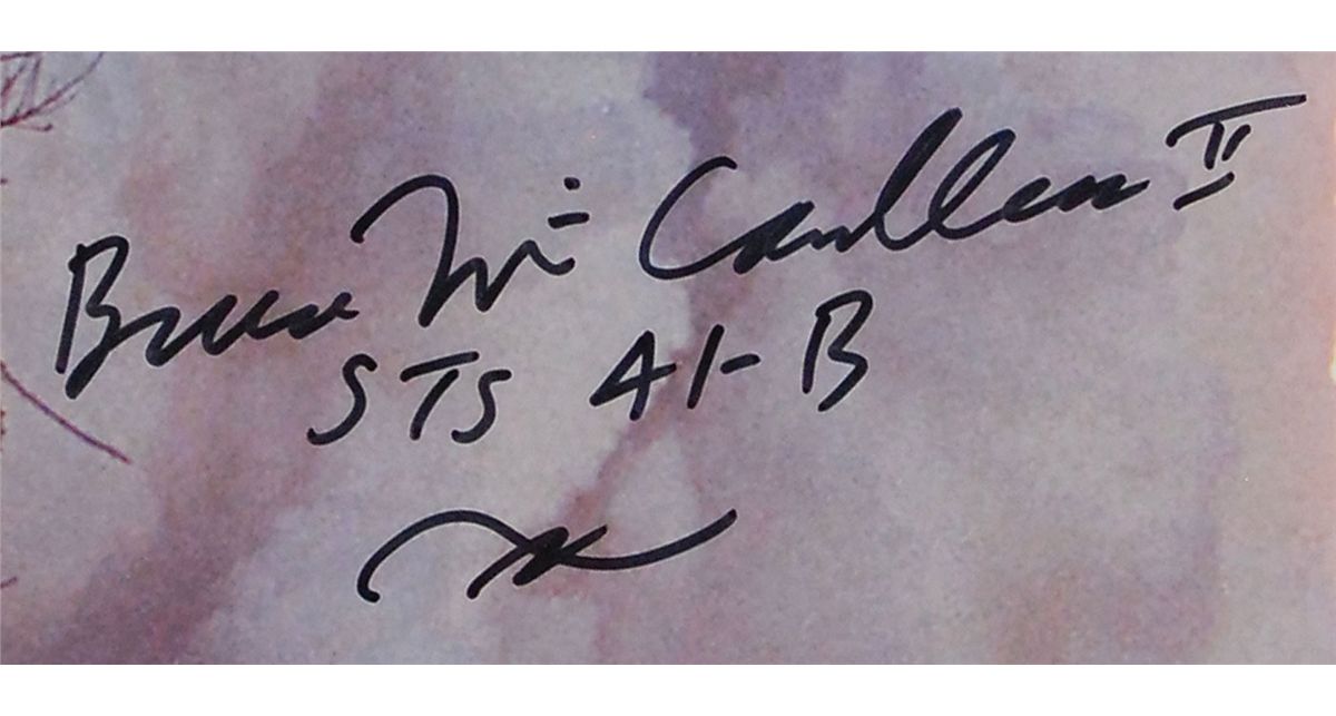 Color satin-finish 16.25 x 20.25 photo of the launch of STS-41B, signed in black felt tip, “Bruce McCandless, STS-41B.” In fine condition. Accompanied by a printed photo of McCandless taken at a 2004 signing in California.