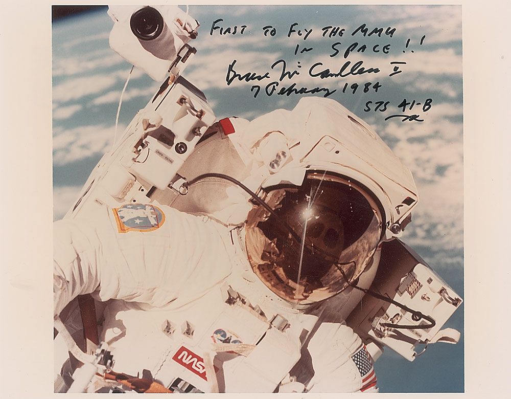 Color satin-finish 10 x 8 NASA photo of McCandless performing his historic EVA, signed in black felt tip, “First to fly the MMM in space!! Bruce McCandless II, 7 February 1984, STS 41-B.” In very fine condition.