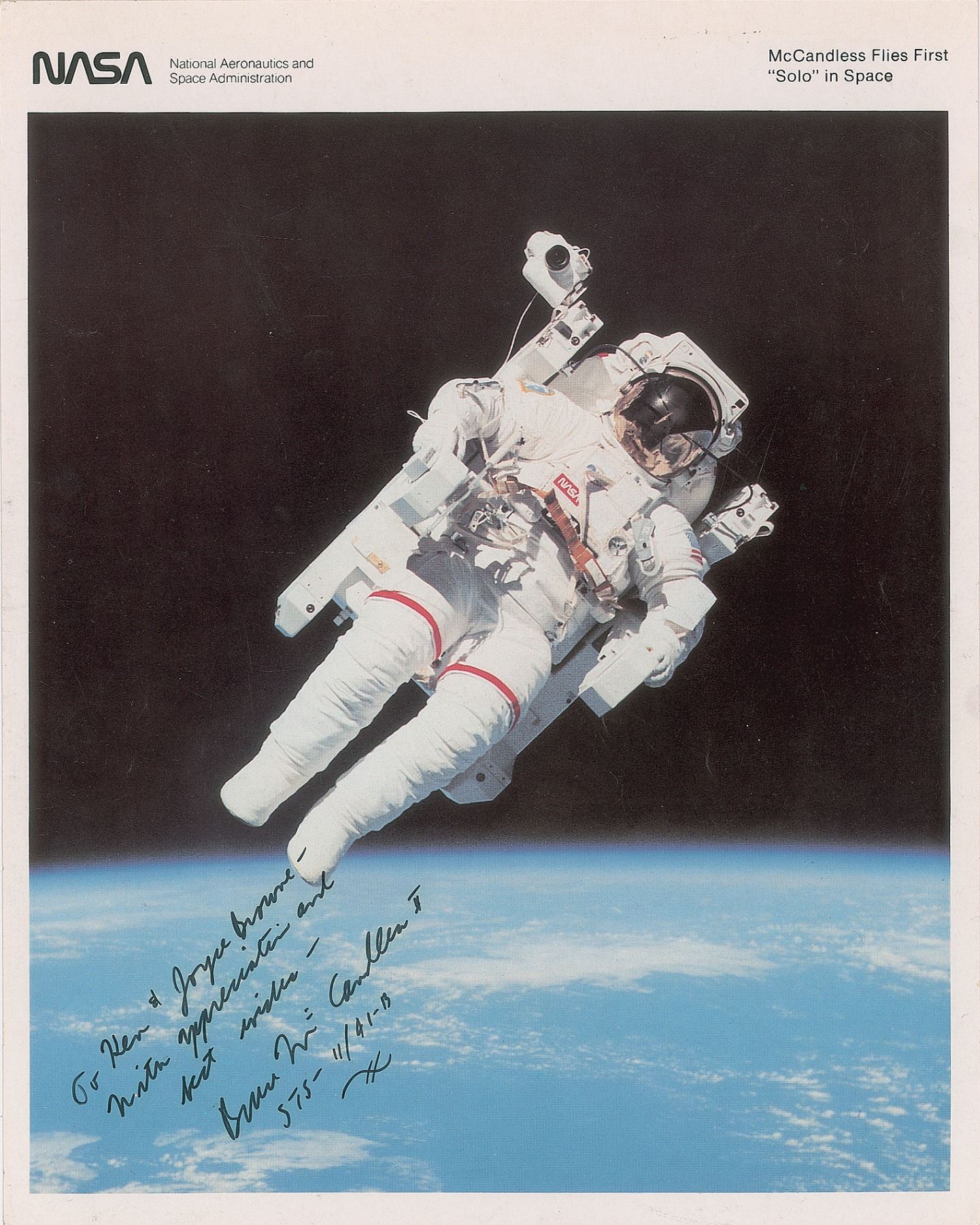 Official color 8 x 10 NASA lithograph of McCandless performing his historic untethered space walk, signed and inscribed in black felt tip, "To Ken & Joyce Browne, with appreciation and best wishes—Bruce McCandless II, STS–11/41–B.” In very good to fine condition, with scattered light creasing.