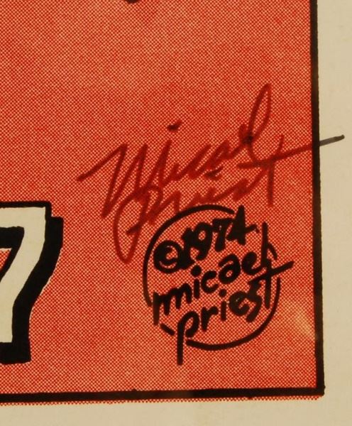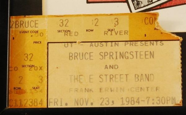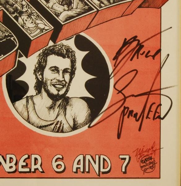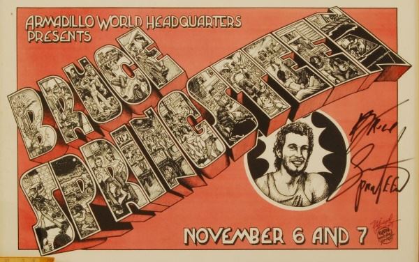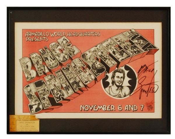 Armadillo World Headquarters, November 6-7, 1974. Poster autographed by Bruce Springsteen at a concert 10 years later in Austin. Comes with ticket stubb from that concert. Poster Artist: Micael Priest.