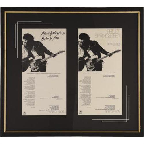 <B>Bruce Springsteen "Born to Run" Framed 45 Slicks.</B></I> Bruce Springsteen's third album, <I>Born to Run,</B></I> was a breakthrough hit that launched his career in the worldwide. The cover art for the LP and 45 single of the title track is one of Rock music's most iconic images. The photo was taken by Eric Meola in 1975, who shot more than 900 frames during the three hour session. Ironically, the shot used for the cover features Springsteen's planned in a candid, unplanned pose, casually leaning against bandmate Clarence Clemons after plugging into an amp. The narrow font that was used on the mass produced version was, at the time, unheard of. Featured are two slicks featuring unused designs for the "Born to Run" 45 single, matted and framed together to an overall size of 23" x 22". These are two of four designs that ultimately went unused when the single was released. Both are in Very Fine condition with some small stains evident.<BR><BR><b>Shipping:</b> Framed - with Glass, Medium (<a target="_blank" href="http://www.heritageauctions.com/common/shipping.php">view shipping information</a>)