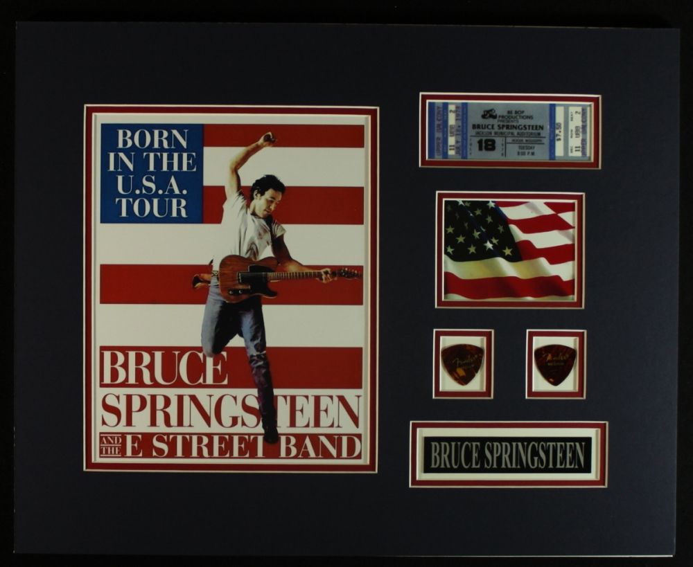 This piece measures 16x20 in size and is highlighted by 2 Fender guitar picks. The picks have been custom matted with an 8x10 photo of Bruce Springsteen.