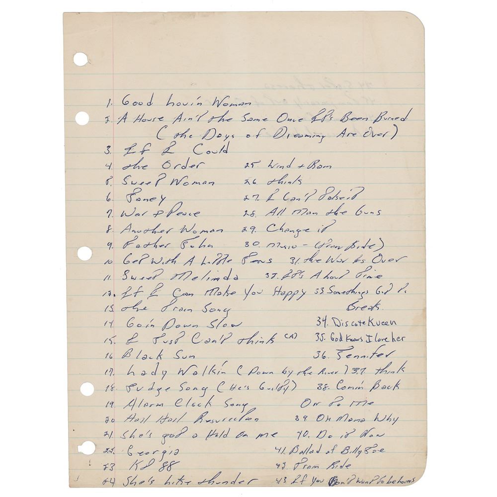 Unusual handwritten song list by Bruce Springsteen, one page both sides, 7.75 x 10.5, no date. Desirable handwritten list naming the titles of 47 songs, including several early Springsteen songs from his time with Steel Mill; among the songs listed a "Good Lovin' Woman," "Janey," "Sweet Melinda," "The Train Song," "Goin' Down Slow," "Black Sun," "Hail Hail Resurrection," "Georgia," "All Man the Guns," "Oh Mama Why," "Train Ride," "Sister Theresa," "Temporarily Out of Order," "Come On," and "America Under Fire." In fine condition. Accompanied by a full letter of authenticity from Beckett Authentication Services. Steel Mill was an early Springsteen band active from 1969 to 1971, which included three future members of the E Street Band—Vini Lopez, Danny Federici, and Steve Van Zandt.