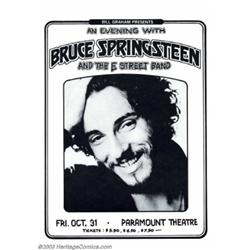 Bruce Springsteen - Music Memorabilia Posters, Promo Group (Randy Tuten). A pair of posters promoting "The Boss." These posters were printed by Randy Tuten from the ads he did for Bill Graham Presents. One of them is signed by Randy Tuten. The smaller of the two has a crease on the lower left corner. These posters measure 11.5" x 16" and 12" x 18". ***** 2 items Important notice: Heritage usually auctions material at the rate of 200-250 lots per hour. On some occasions eBay Live bid software or the Internet may not be able to keep up with the pace of the auction. We recommend placing a realistic absentee bid now as insurance to avoid disappointment. Occasionally the auctioneer may eliminate or reject an eBay Live bid, and the auctioneer may also reopen a lot after the close of the eBay live bidding (usually because we missed an audience bid), and may reject your bid even if it shows you as the winning bidder. By bidding via eBay Live, you agree that Heritage may award the lot to another bidder at its sole discretion under the circumstances described above or any other reasonable circumstances. Also please note that all Heritage lots purchased through eBay Live carry a 20% Buyer's Premium. Please make sure you read the Terms and Conditions before you bid.